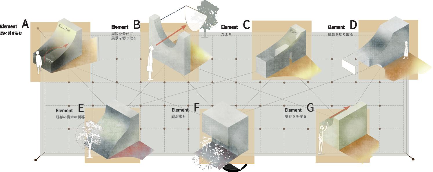 è¡ã¯ããã©ã³ãè¡ãšå¯Ÿæ¯ããããã«ãç©åœ¢ãåè§åœ¢ã®éåäœãªã©èªå·±äž»åŒµã ãªã圢ç¶ãå€ãã£ãã 建ç¯ã®æ§æåçãšããŠã·ã¥ãŒã«ã¬ã¢ãªã¹ã ã®ææ³ã§ããããã€ã¹ãã³ã®æŠå¿µã çšããã衚åéã®ç¹åŸŽçãªãã¡ãµãŒããéžã³ãå€åœ¢ãæœåºãããããããäžã ããã建ç¯ã®æ©èœããæœåºããç°¡åãªããŒã¯ãŒããšåœ¢ç¶ã®ã€ã¡ãŒãžãæãåã ããŠå»ºç¯ç©ºéãæ§æããã [ããã€ãºãã³] æ¬æ¥ã®ç°å¢ããå¥ãªãšãããžç§»åããããšã§æ¬æ¥ããã¹ãå Žæã«ç¡ããã®ãåº äŒãããŠéåæãæããããããšã ïŒ PatternCircleGrometry 03 IDEA ãŒããã€ãºãã³ãçšããèšèšææ³ãŒ â ïŒ
