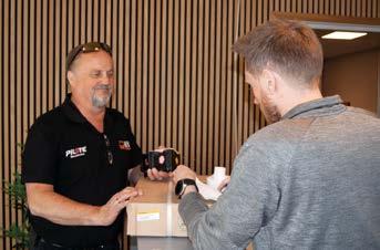 Han betalar i kassan, som skickar ordern direkt ner till vårt lager. På lagret vet de att Anders Träff är på väg och ser till att skynda på. Någon minut senare stegar Anders Träff in på varuutlämningen och hämtar de båda delarna: en vridplatta till en stol och ett vattenintag för husbil.