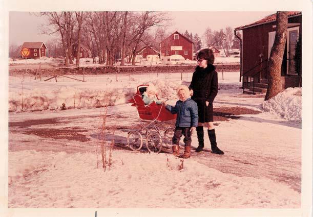 Christer och lillasyster Christina i barnvagnen tillsammans med mamma Lena 1968.