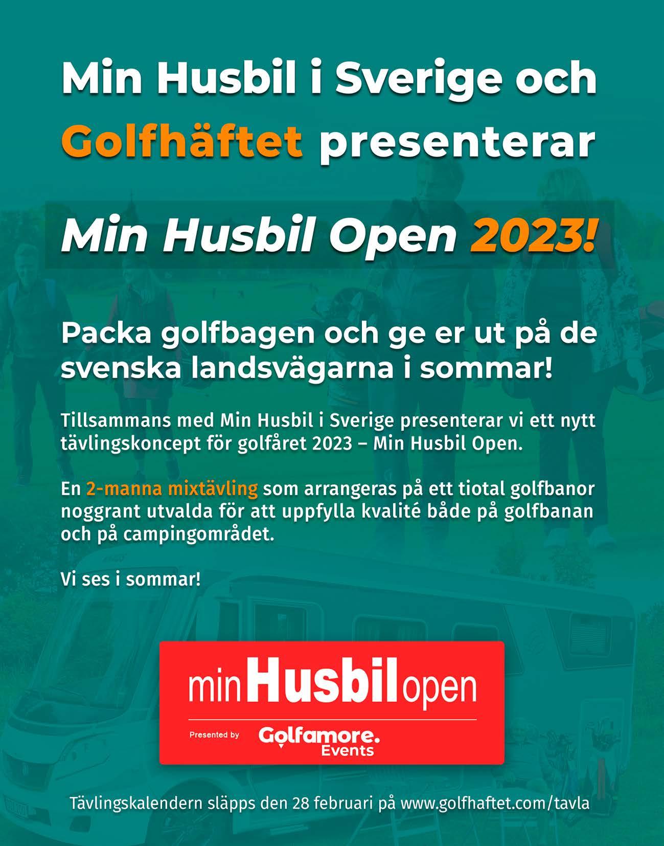 Ni undrar förstås vad jag menar att nu skall vi spela golf och dansa till Lasse Stefanz. I år har Min Husbil i Sverige och Golfhäftet utökat samarbetet rejält. Nu kommer vi tillsammans anordna 10-15 golftävlingar som går under namnet Min Husbil Open på olika golfbanor här i Sverige under sommaren. Spelar ni golf så hoppas jag att ni anmäler er till någon av dessa tävlingar. Man spelar i lag om två, en kille och en tjej. Det kommer bli fina priser där. Mer info om detta finns inne i tidningen och i kommande nummer.