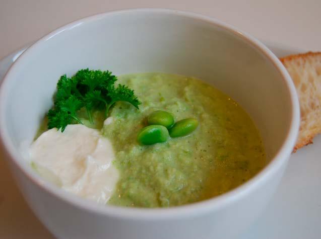 8. Lägg upp i sopptallrikar och toppa med pepparrotskrämen och lite kryddgrönt.
