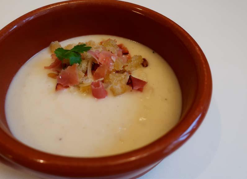 10. Lägg upp soppan i tallrikar. Blanda skinka, bröd och kärnor. Toppa soppan med skink- och brödkrispet.