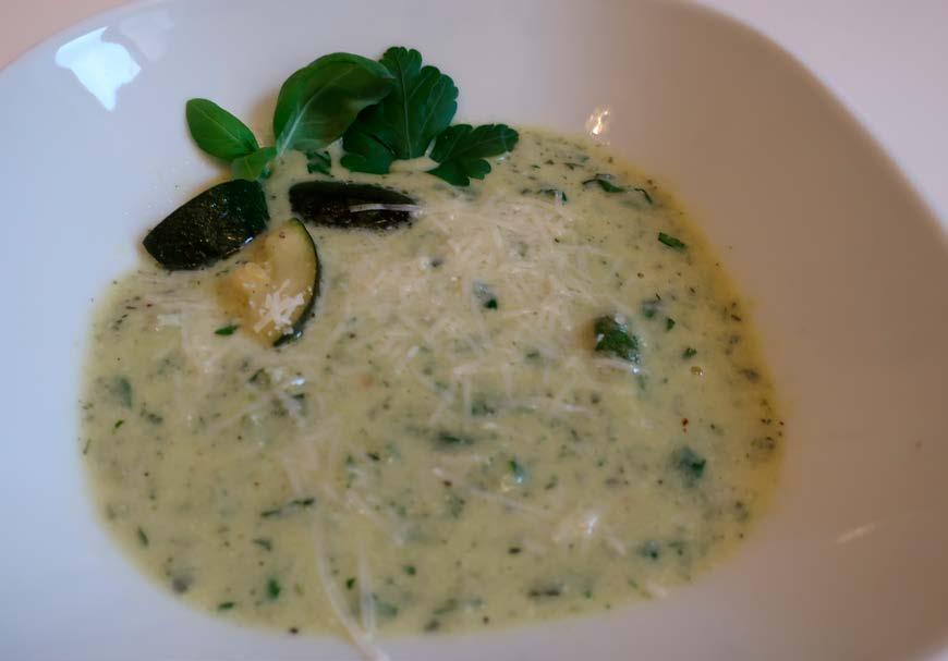6. Smaka av med salt och peppar. Vänd ner örterna och drygt hälften av osten i soppan. Toppa med resten av osten, lite örter och någon hel bit zucchini.