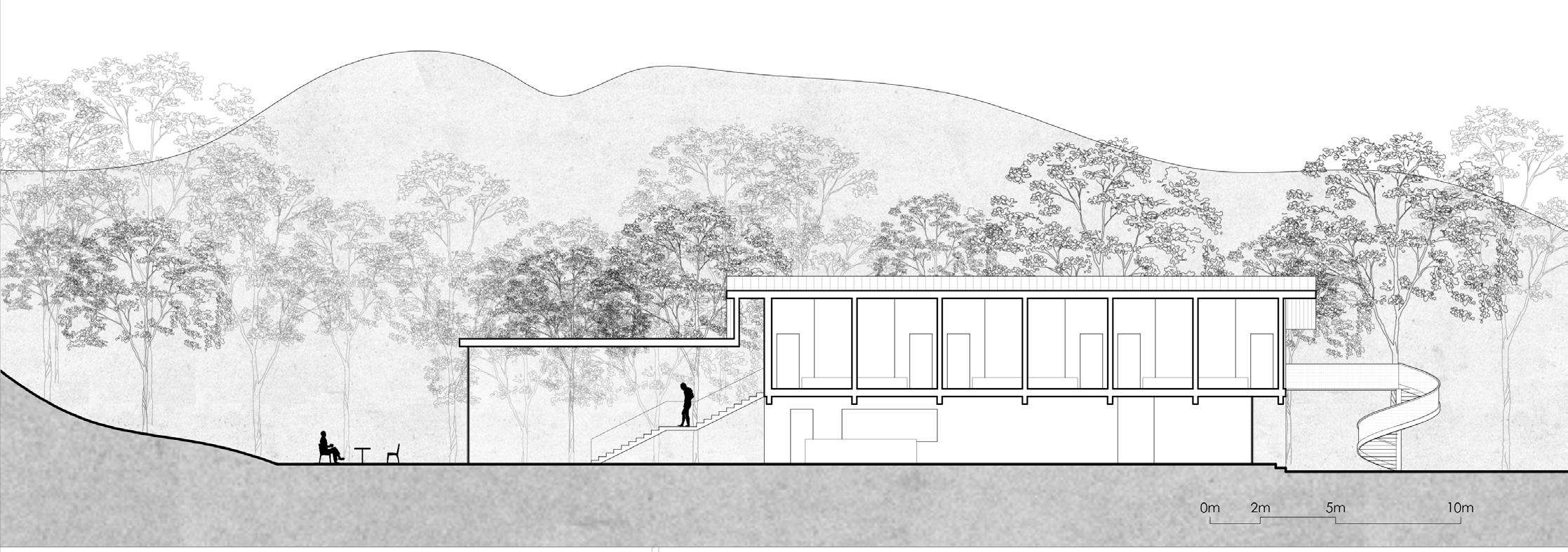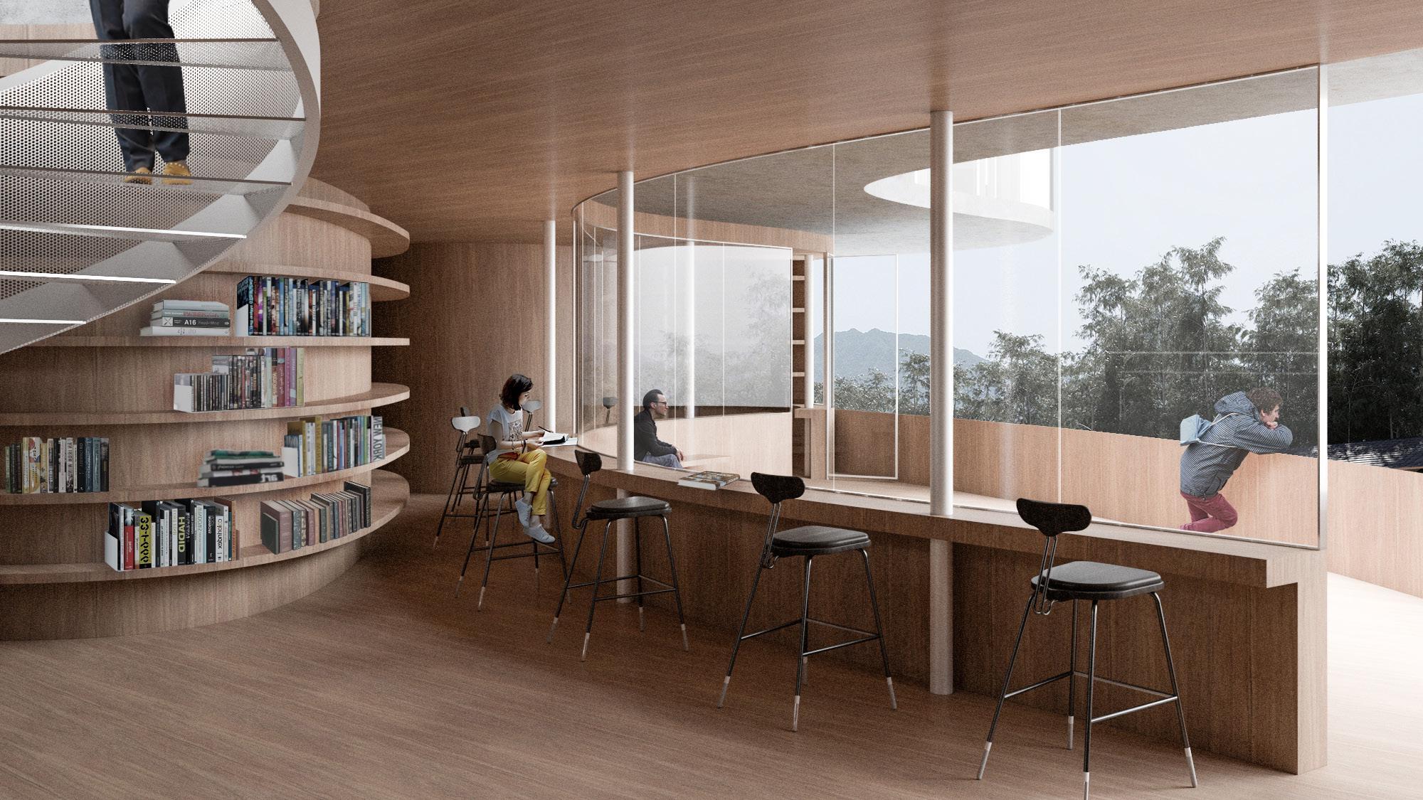 4. through a sprial stair, visitors can get down to the lower floor which contains the main library and all the services, it is warmer and more focused compared to the upper floor, it also has a platform open towards the hills.