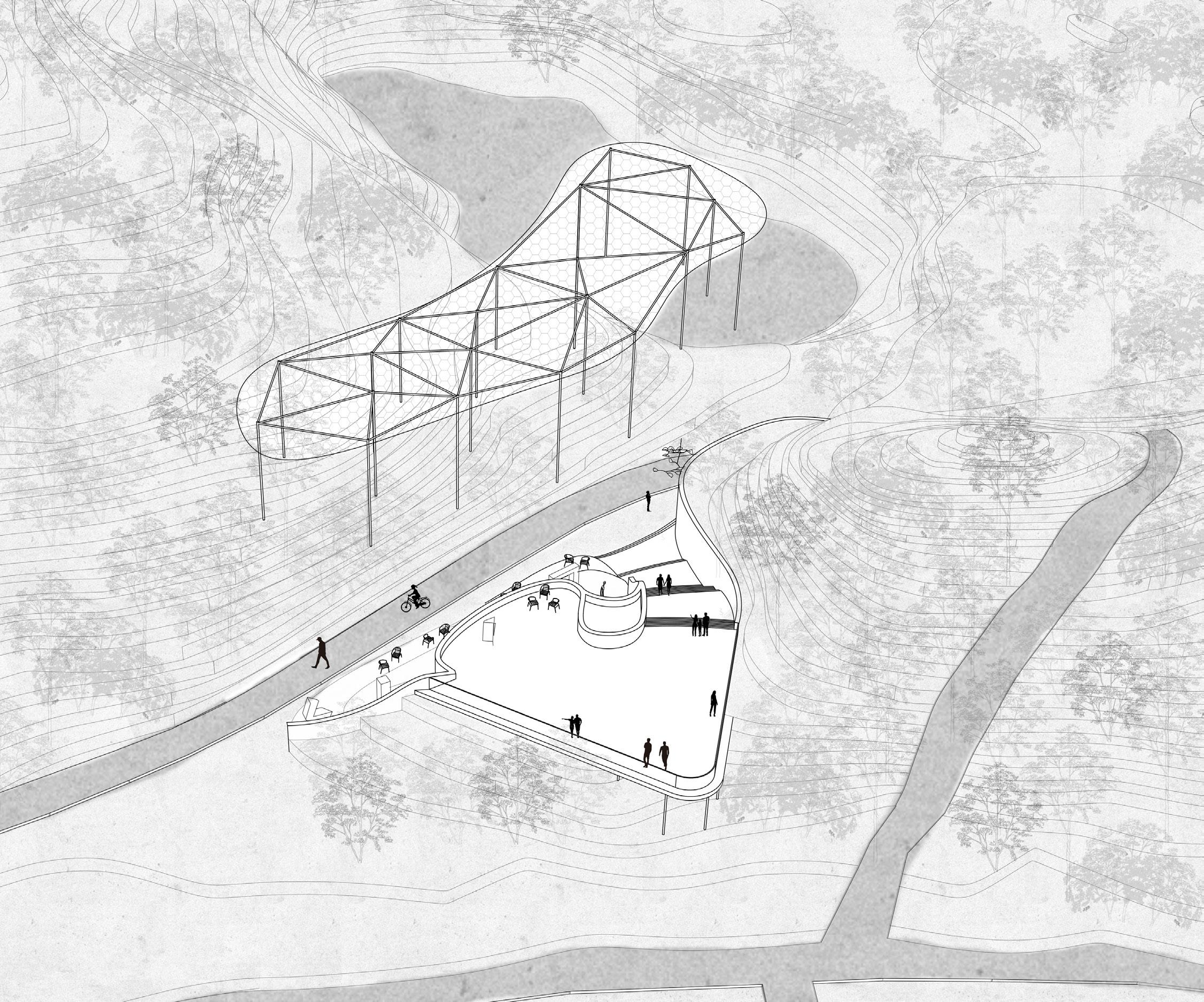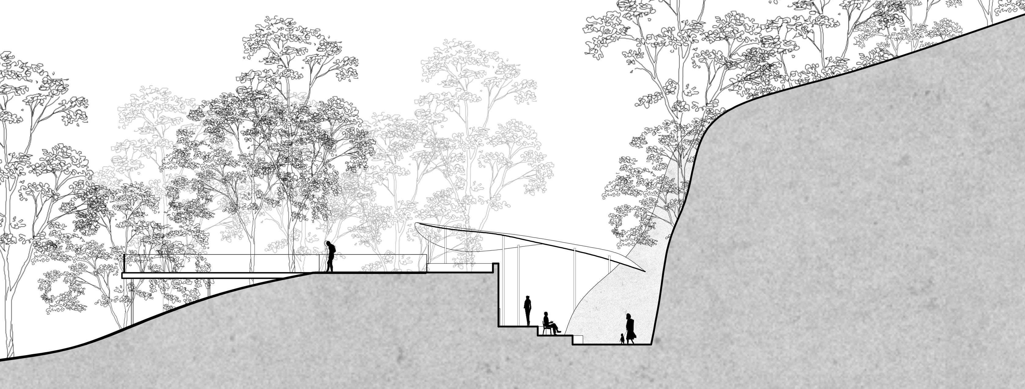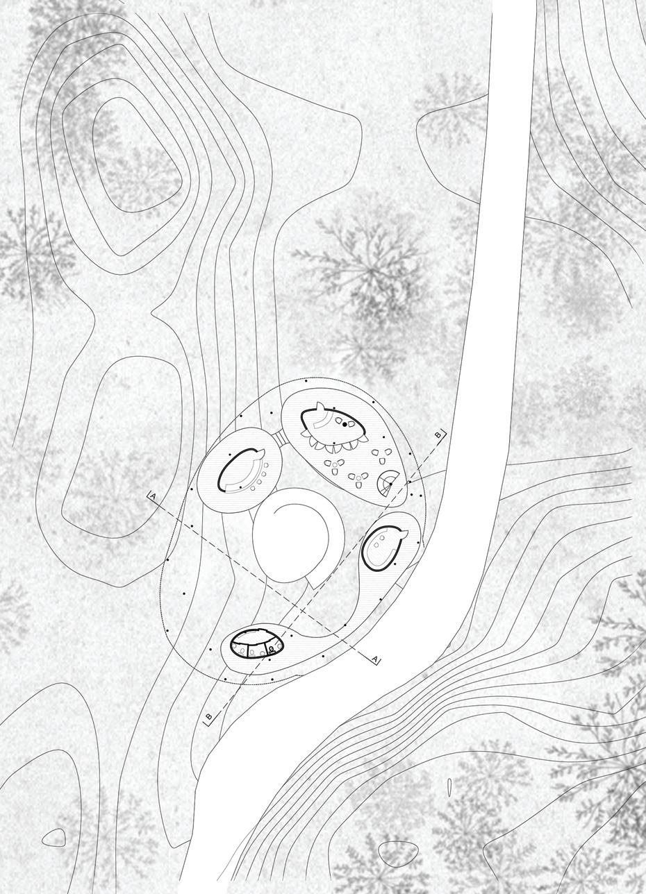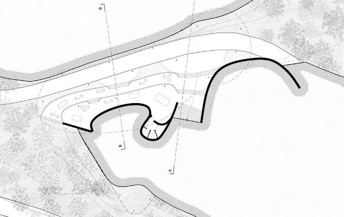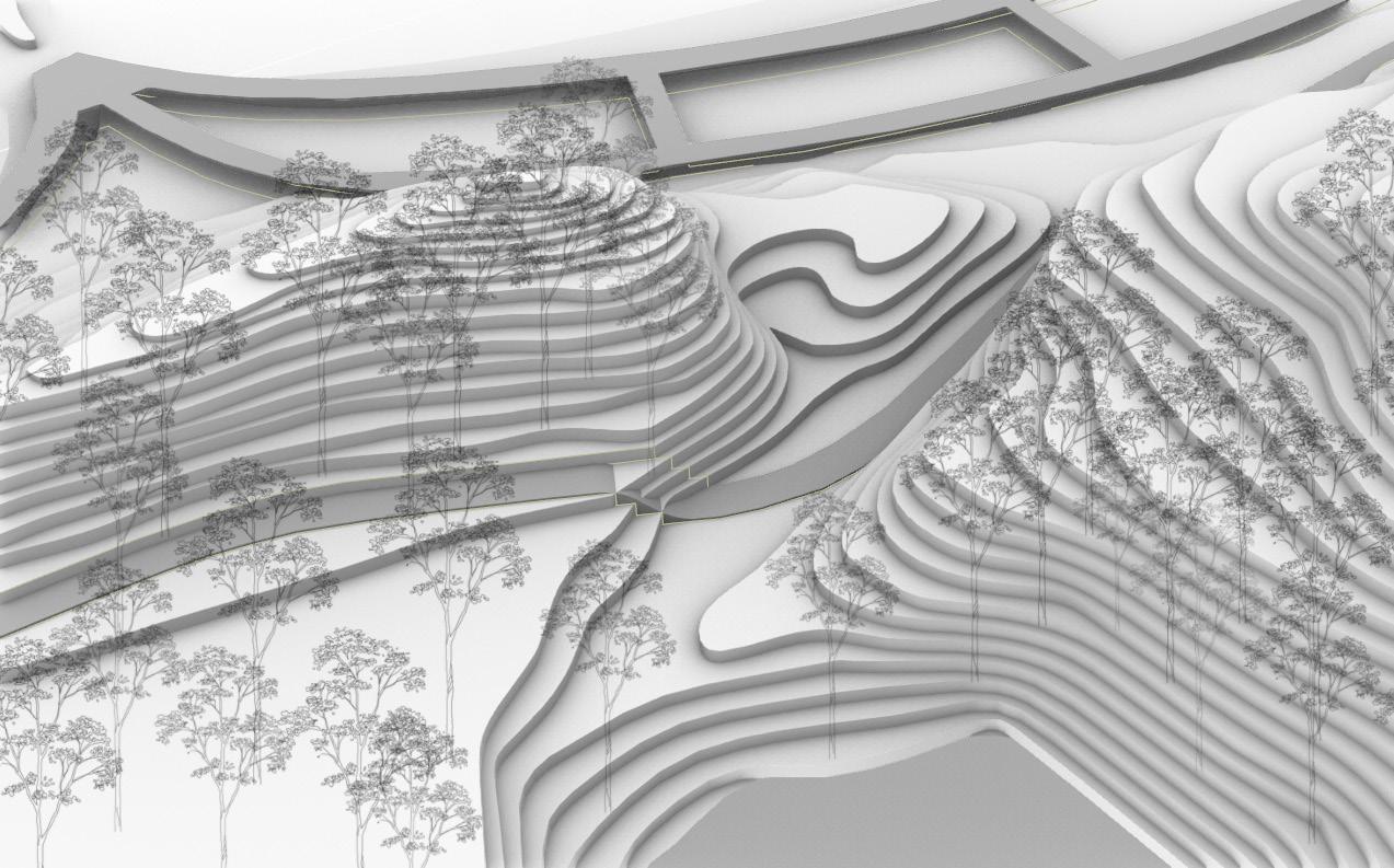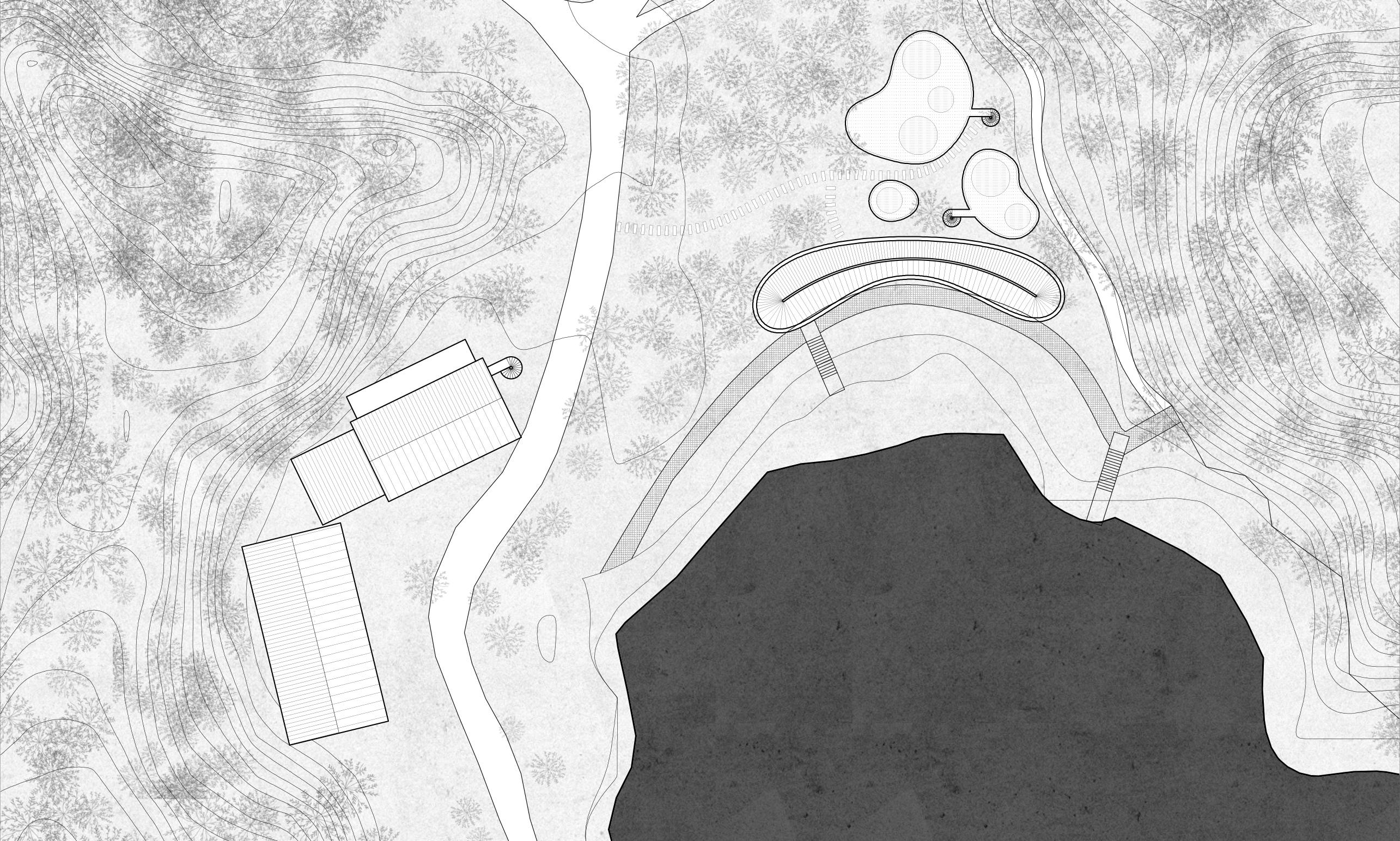 1. reshaped it right according to the contour lines to better fit into the landscape. people can access to it through a narrow brige hidden in the trees.