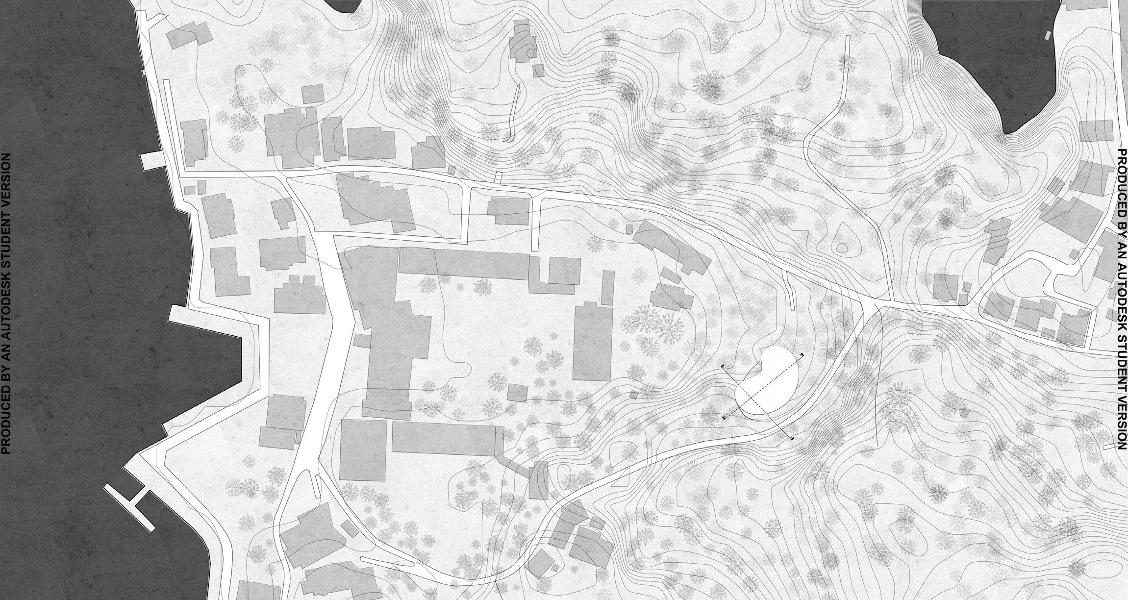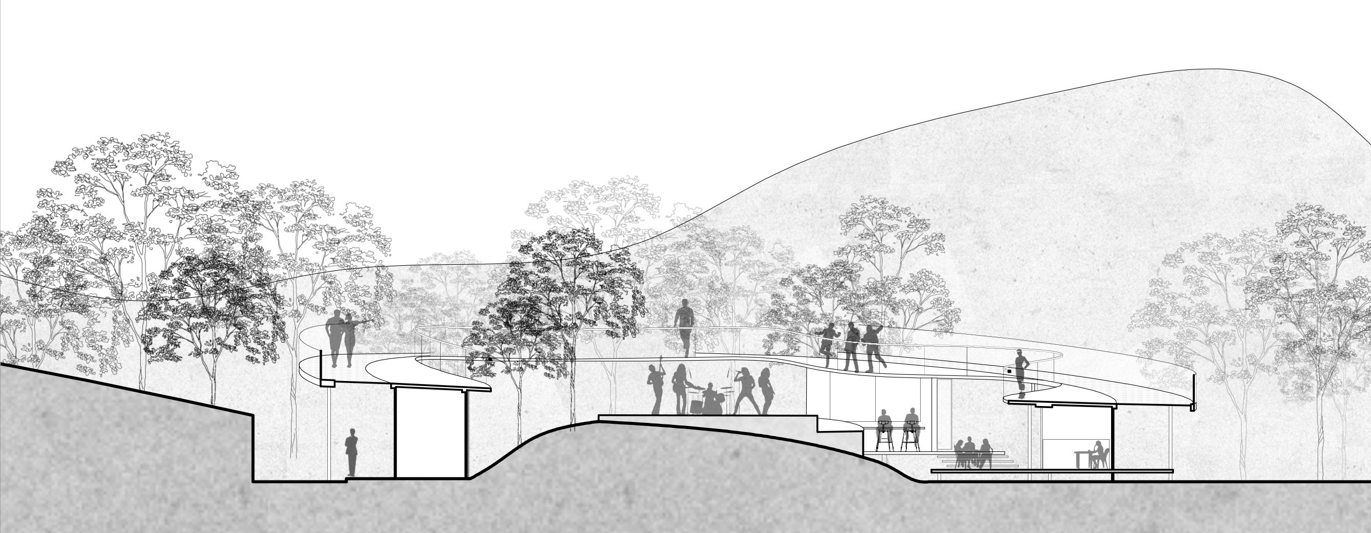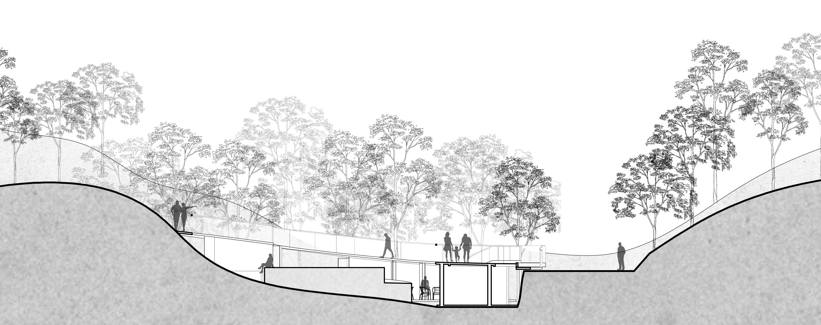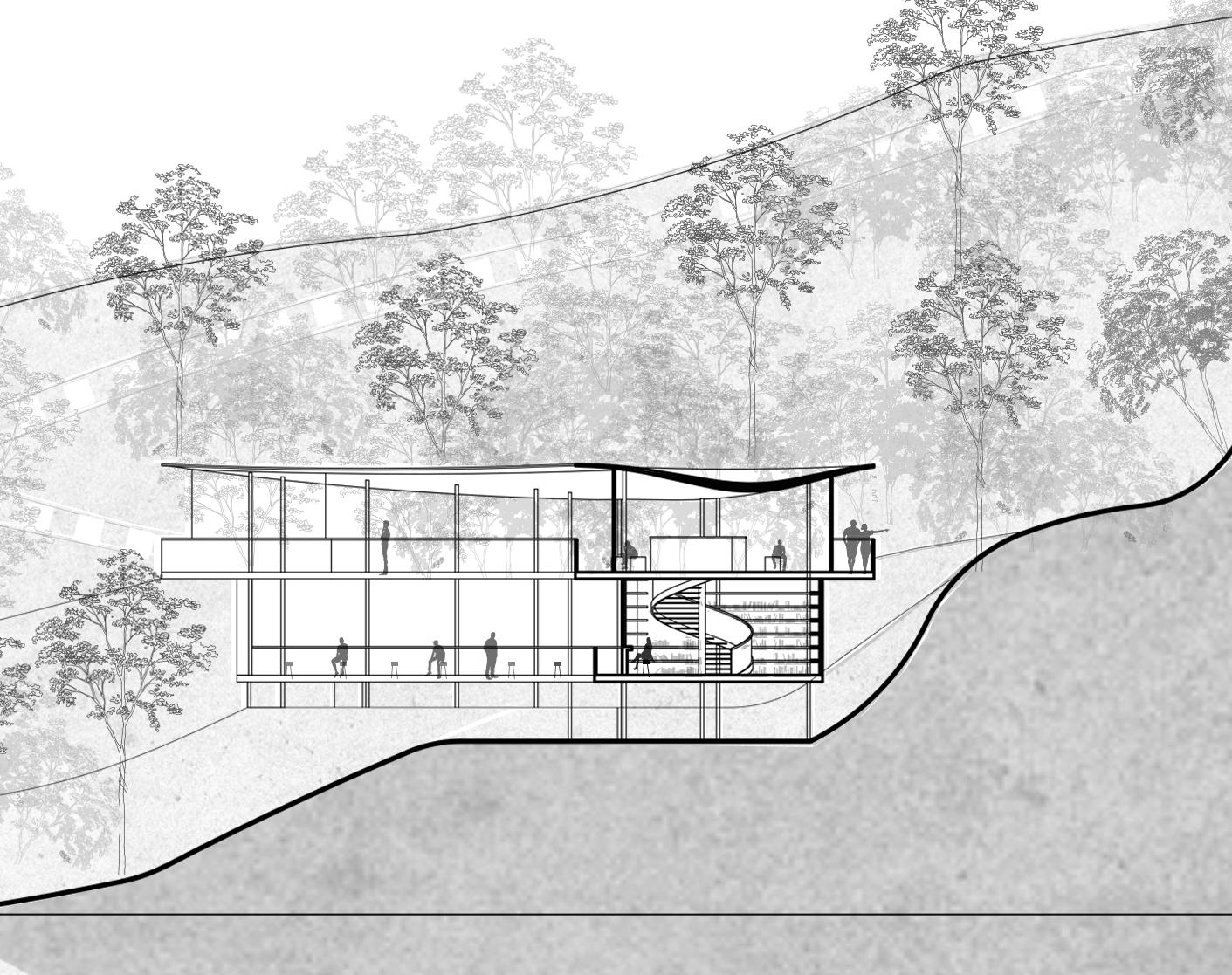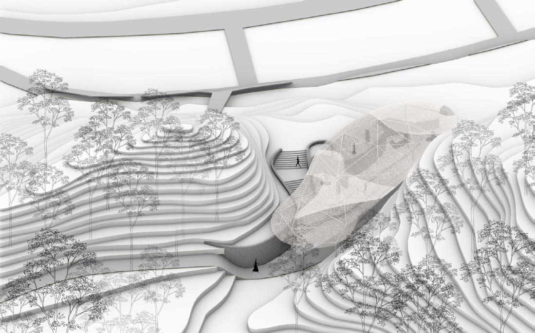 1. reshaped it right according to the contour lines to better fit into the landscape. people can access to it through a narrow brige hidden in the trees.