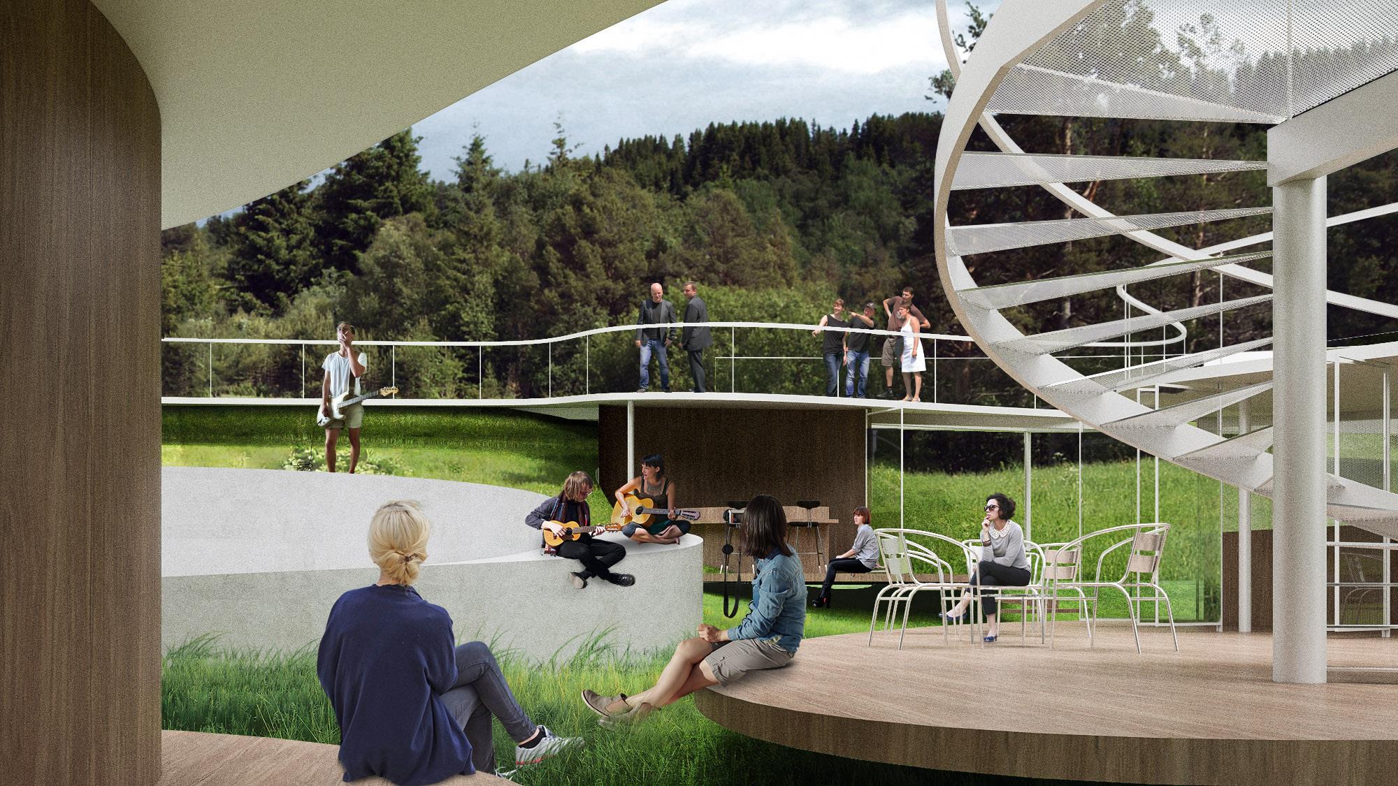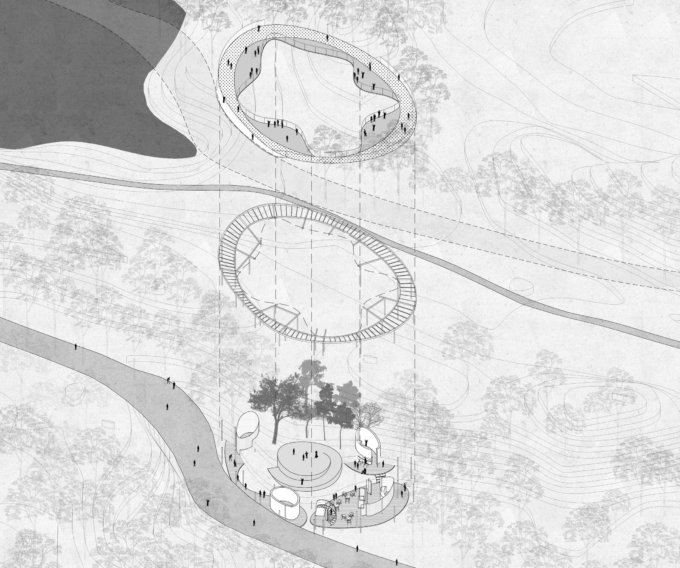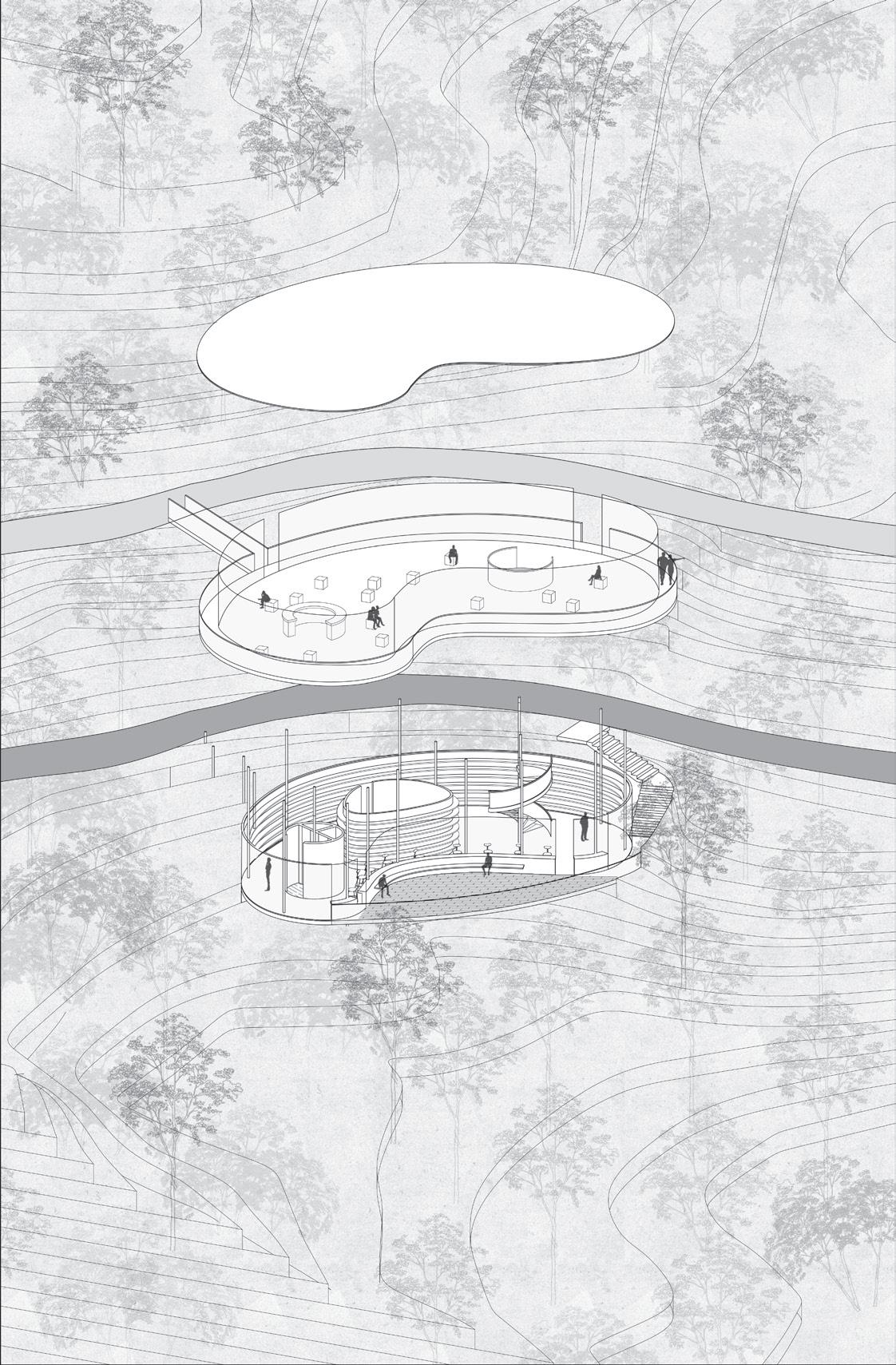 2. with the stage at the center of it, our project consists of 2 levels, with a floating platform for the audience and the lower bubble shaped volumes as the cafe and backstage.