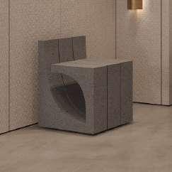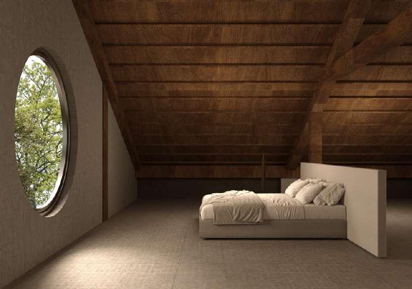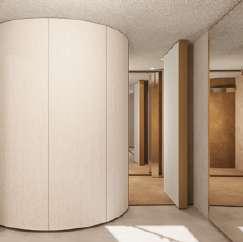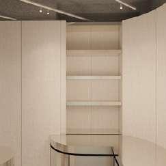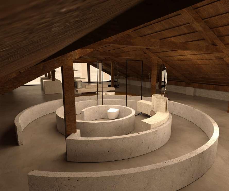 In this attic apartment, the bathroom features a spiral plan. At its center is the toilet, surrounded by a shower and a sink in the outer ring. This layout ensures privacy without doors. Encircling the spiral is a round corridor functioning as a closet. The whole space is located in the middle of a huge area. Unlike traditional designs where the service area is tucked into a corner with a cubic layout, this design places it centrally, serving as a functional centerpiece. This central location of the bathroom separates the open living room and kitchen from the bedroom, maintaining a gallery-like space without walls. Each element is a sculptural yet functional piece, reflecting the designer’s creative vision.