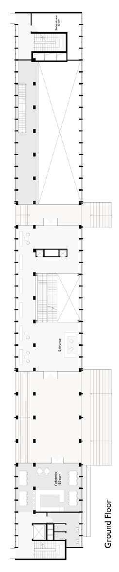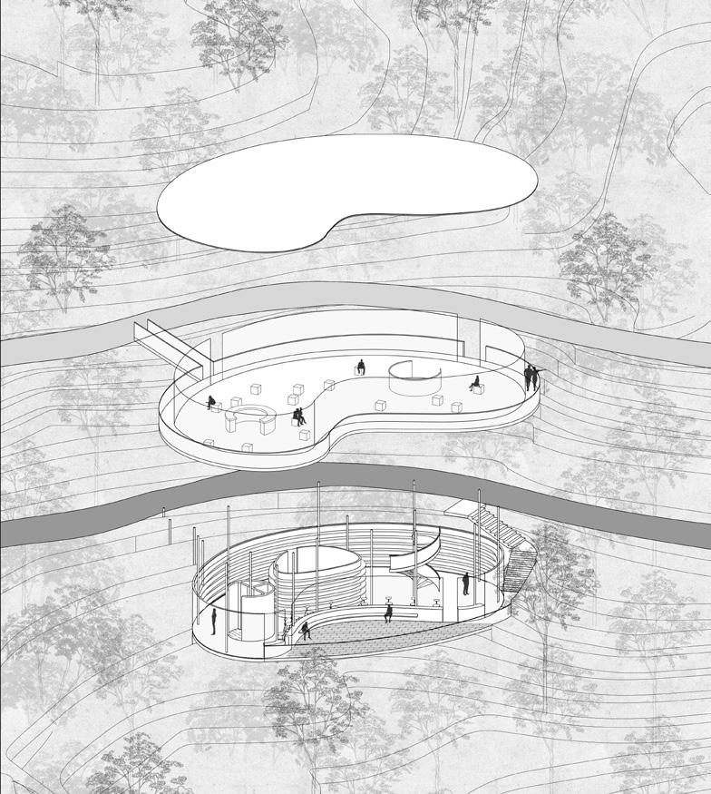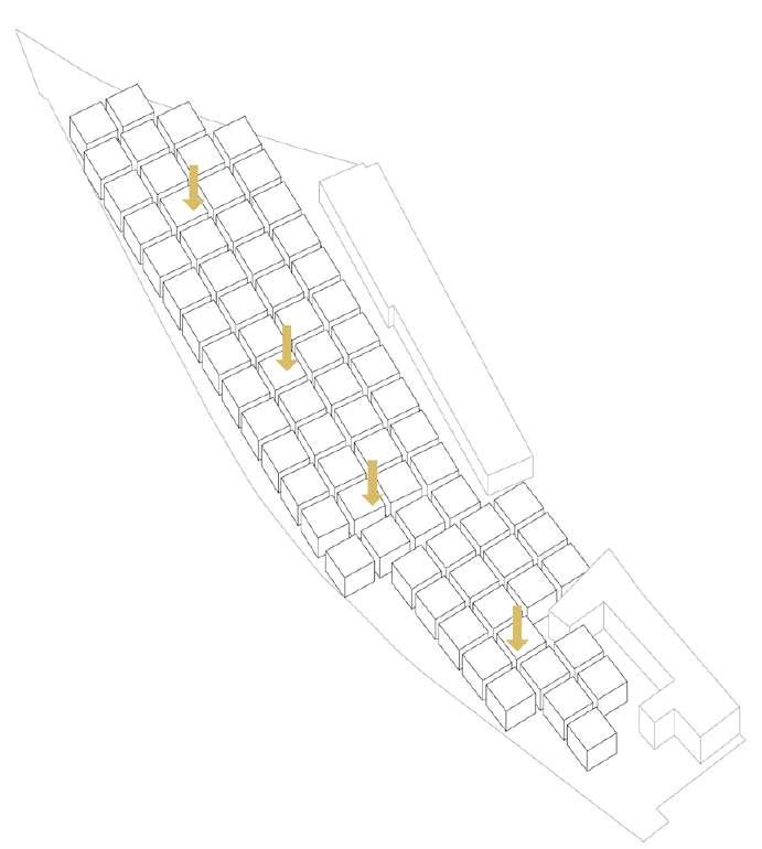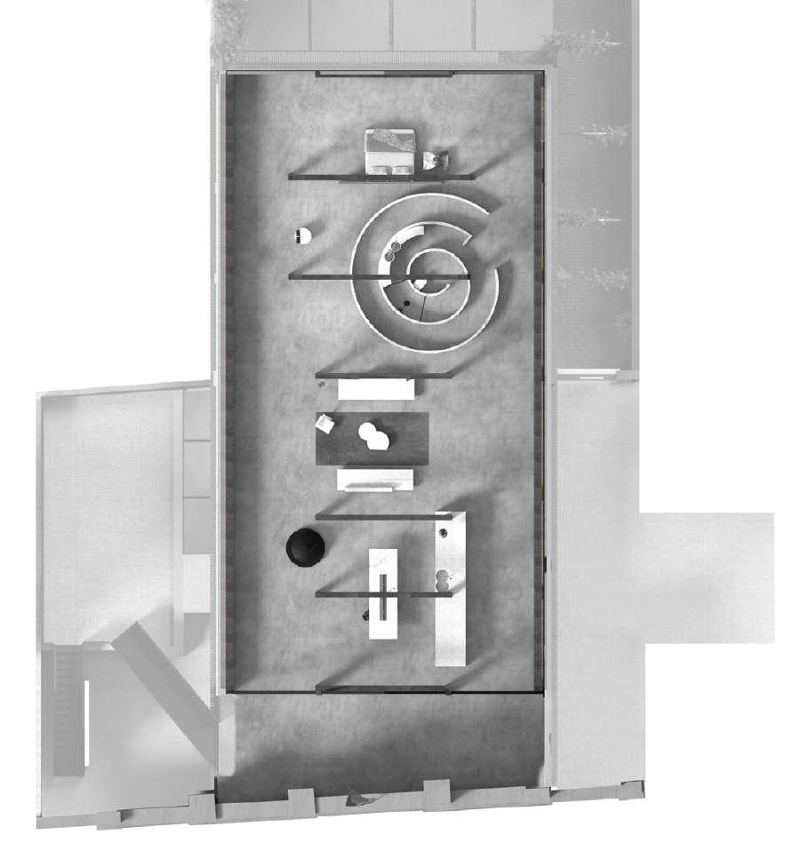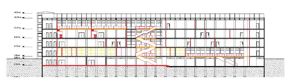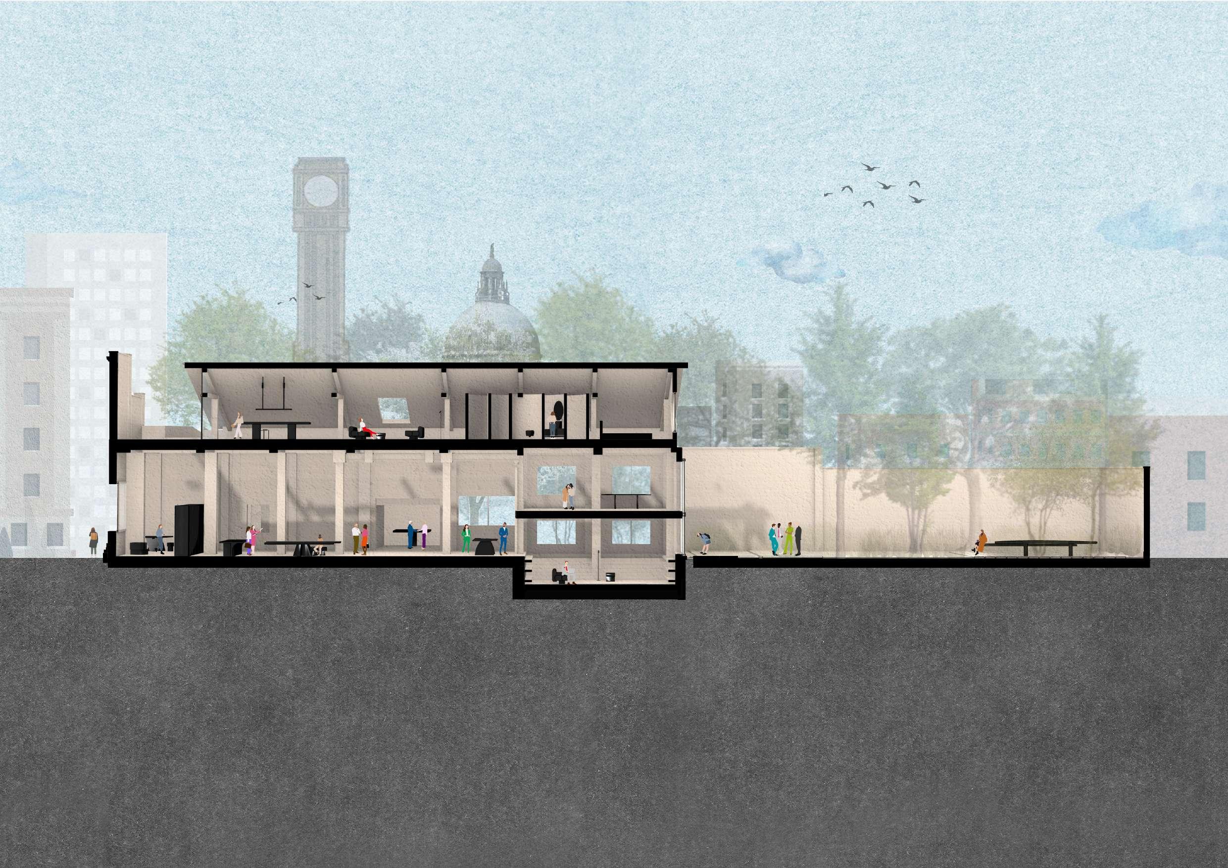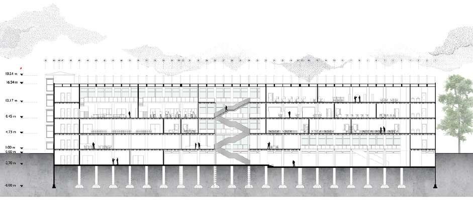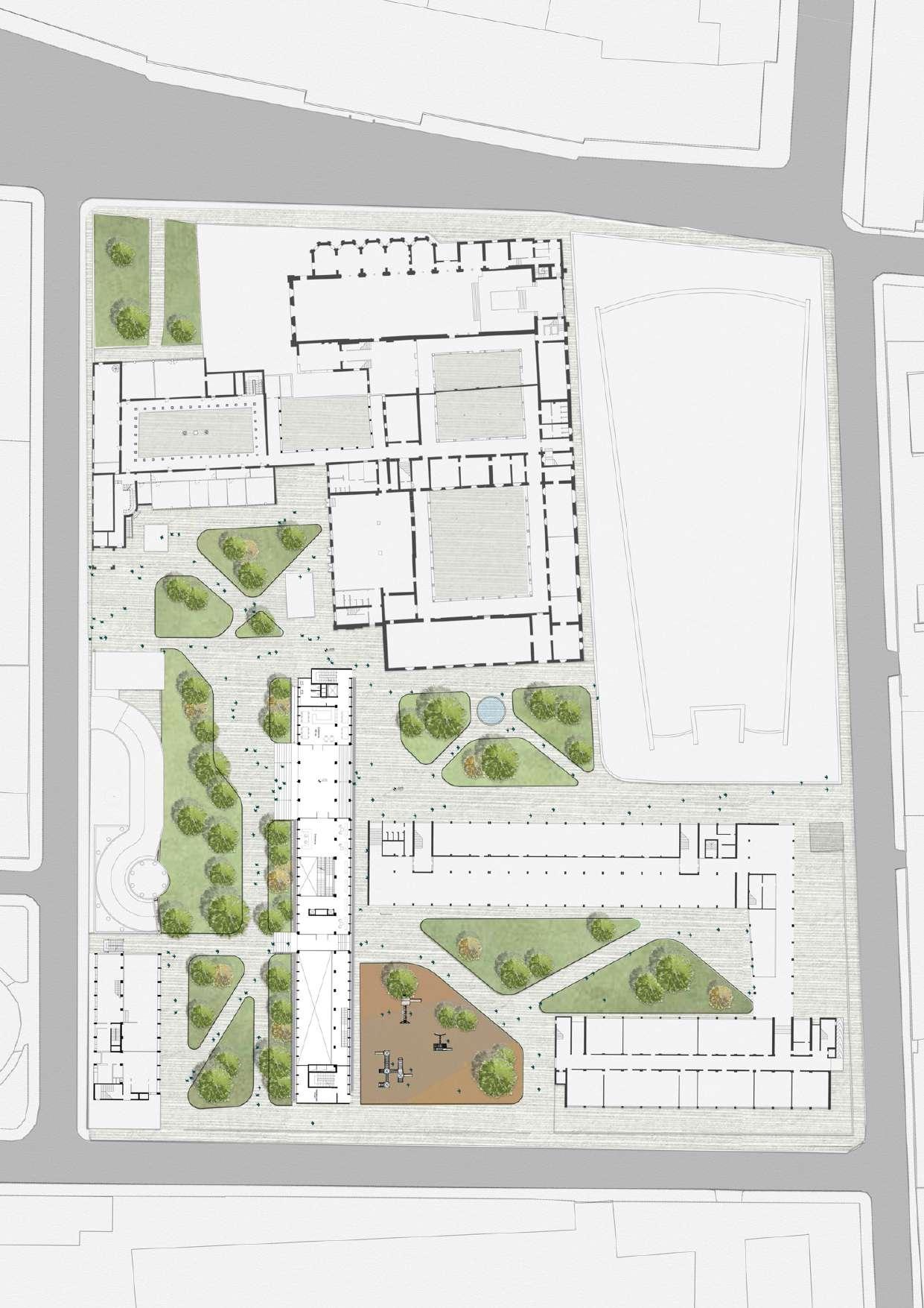 A new set of stairs is merged in the middle of the building to make the inner circulation more effective. A transition is created within the building between the west-east sides of the complex to improve public use and circulation in the site. In the end, we defined new passages and entrances to the building with help of the landscape. The main layout of the structure is preserved and is just going to be adjusted according to proposed spaces