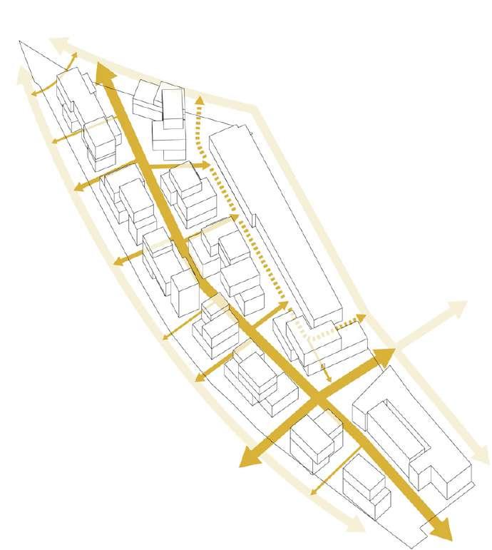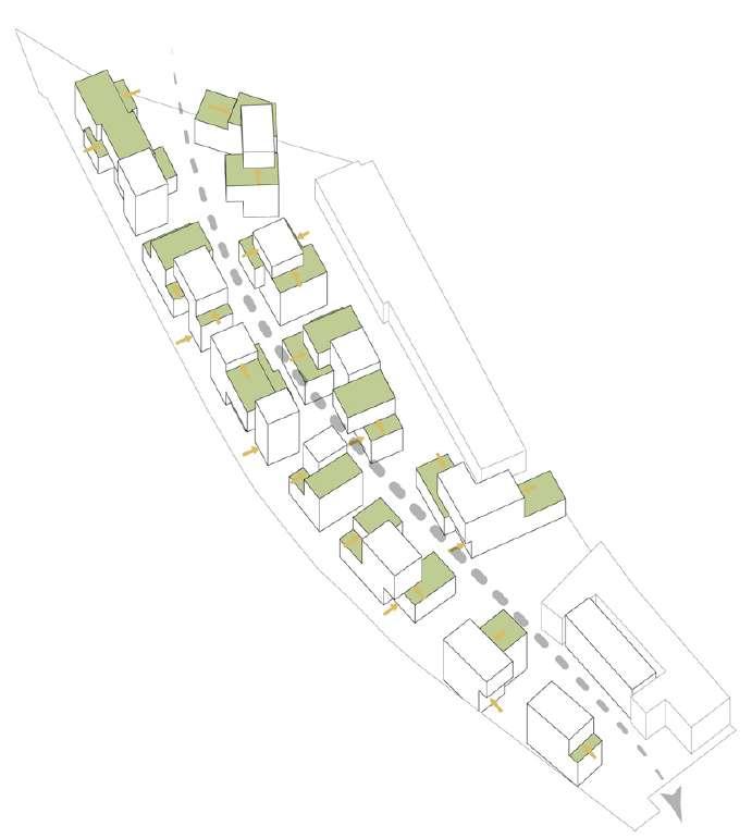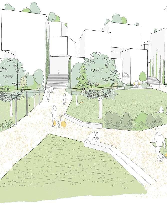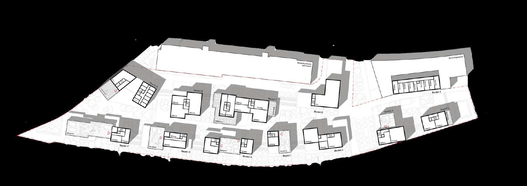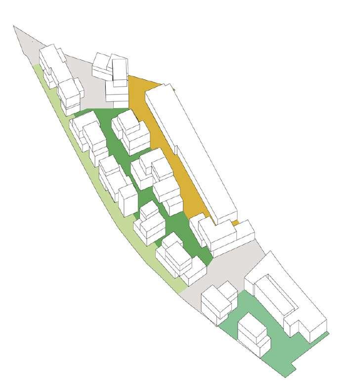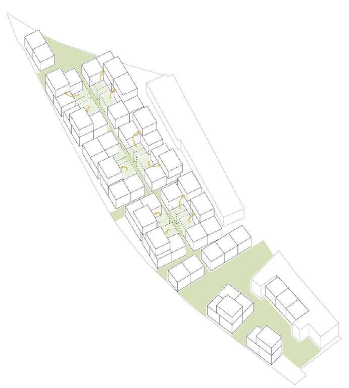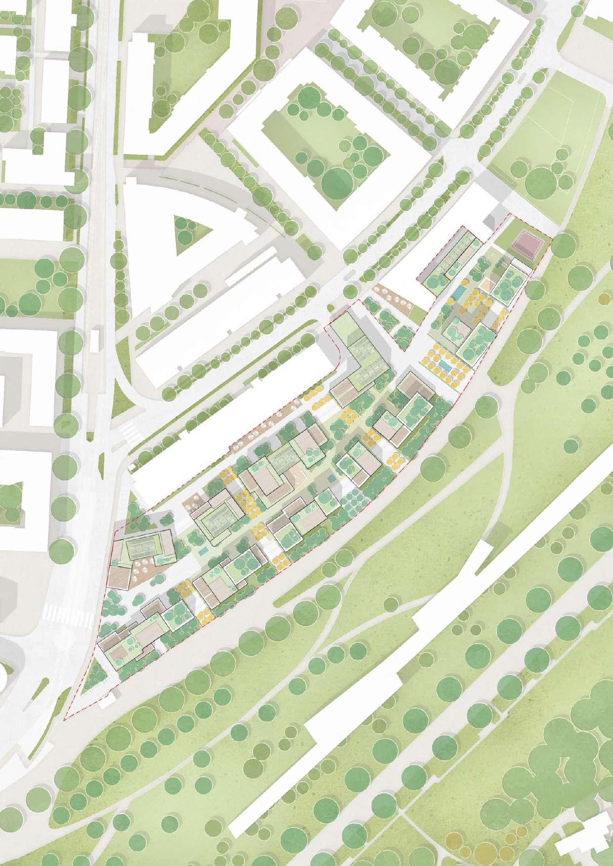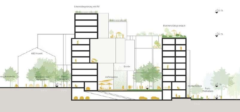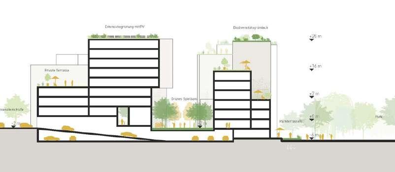 We have designed building clusters that capitalize on the site’s qualities, including views of the developing Gleisbogenpark to the south. These clusters serve as a transition between urban structures and the future park, balancing wide and narrow spaces to create pleasant, varied environments. The clusters, reaching up to 40 meters high, feature roof terraces with stunning views, while their strategic placement ensures green views and park connectivity for all residents. The design facilitates fresh air flow without drafts, with green facades enhancing air quality and temperature control.