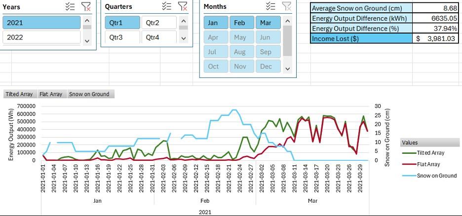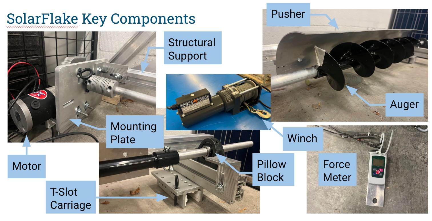 Snowfall on solar panel arrays installed at low angles can render them inoperable during and after snow fall events in the winter season, which in Ontario lasts for the better part of 4 months. This heavily under-researched area causes VCT Group’s (Solar Energy Company) clients to experience financial losses due to the drop-off in solar energy production. SolarFlake is a mock-roof test stand that facilitates the analysis of snow clearing forces on solar panels, to help find cost effective solutions to this problem.