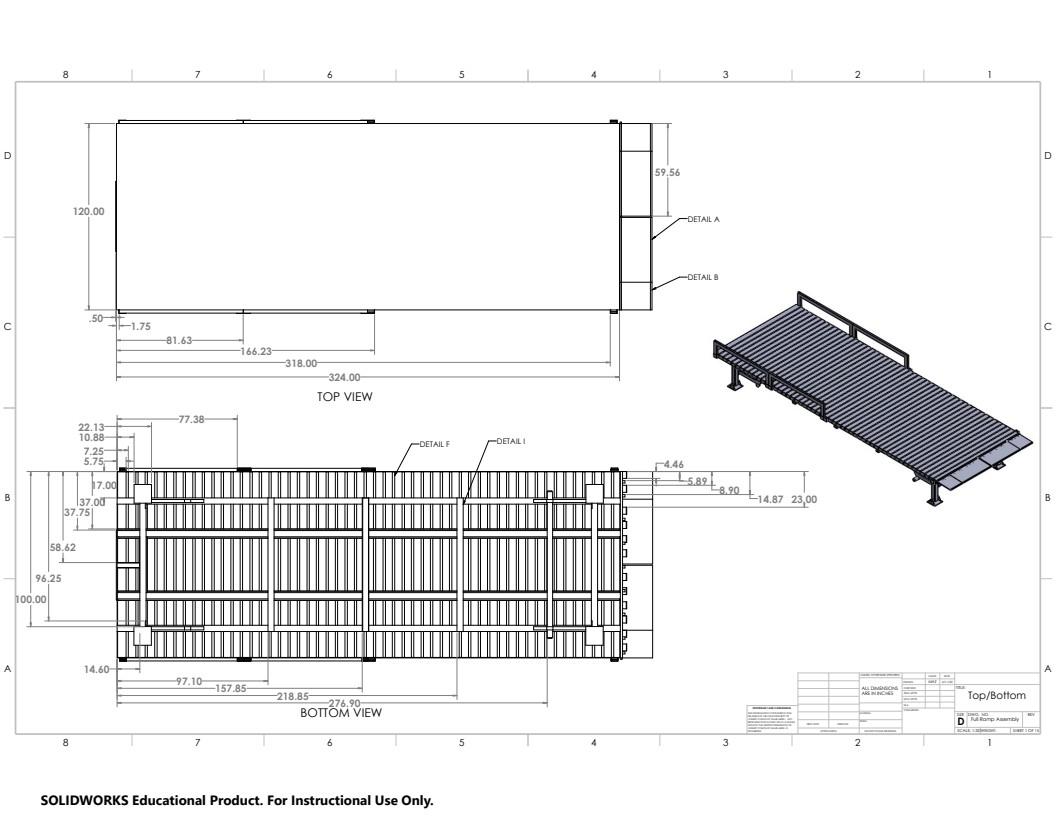 Independently measured, designed, 3D modelled and created manufacturing part and assembly drawings of an offload ramp using SolidWorks.