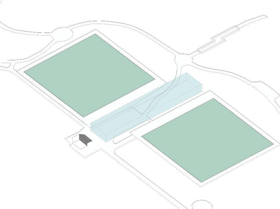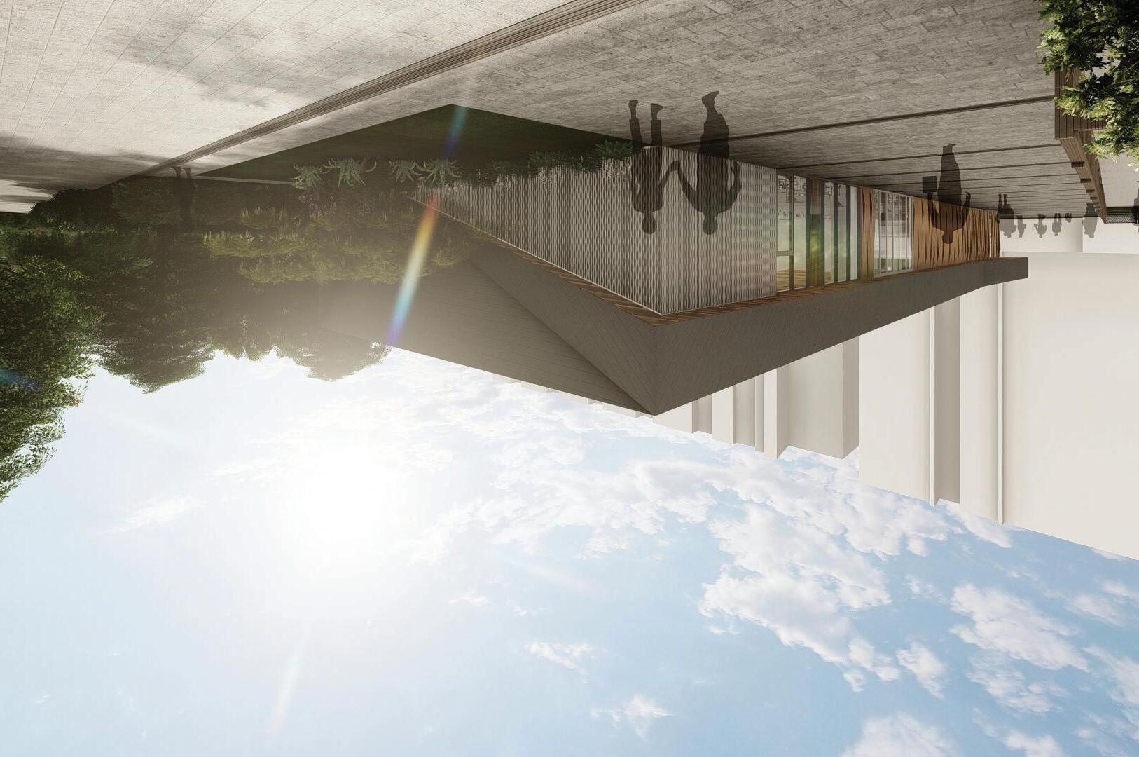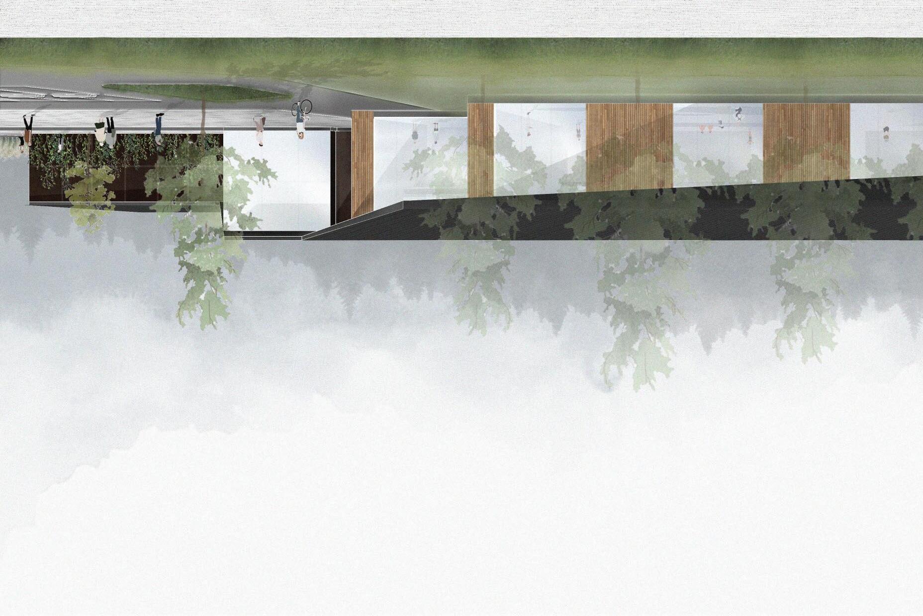 The elevations are further articulated creating visual interest and a connection between the roof element and ground as well as between adjacent functions.