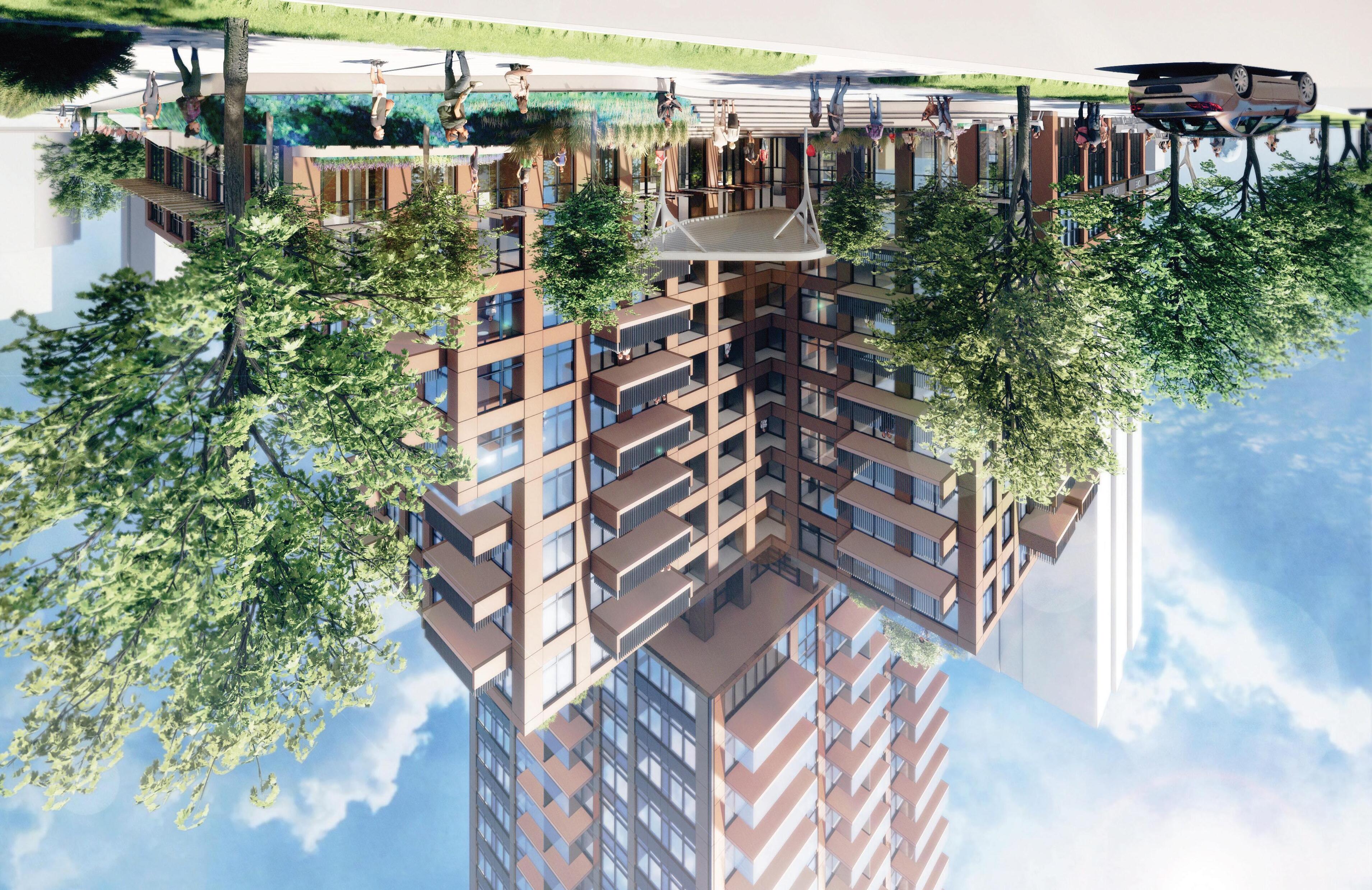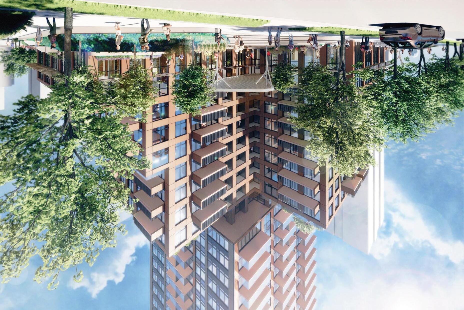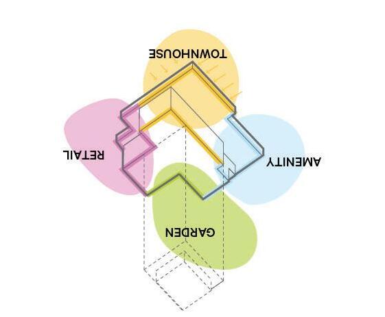 The base of the structure strives to harmoniously integrate with public spaces, fostering a sense of community in parks, plazas, and pedestrian zones; and create links between the indoor and outdoor experience at the ground plane. The tower’s four key ground floor programs (townhouses, retail, garden space, and amenity), establish distinctive connections between the building and its immediate surroundings. The podium is shaped such that it steps down to the north to create a valley condition with its northern neighbour, and a site gateway with its neighbour to the east. The podium rooftop also provides an excellent opportunity at the ninth floor for both east and south facing indoor and outdoor residential amenity spaces.
