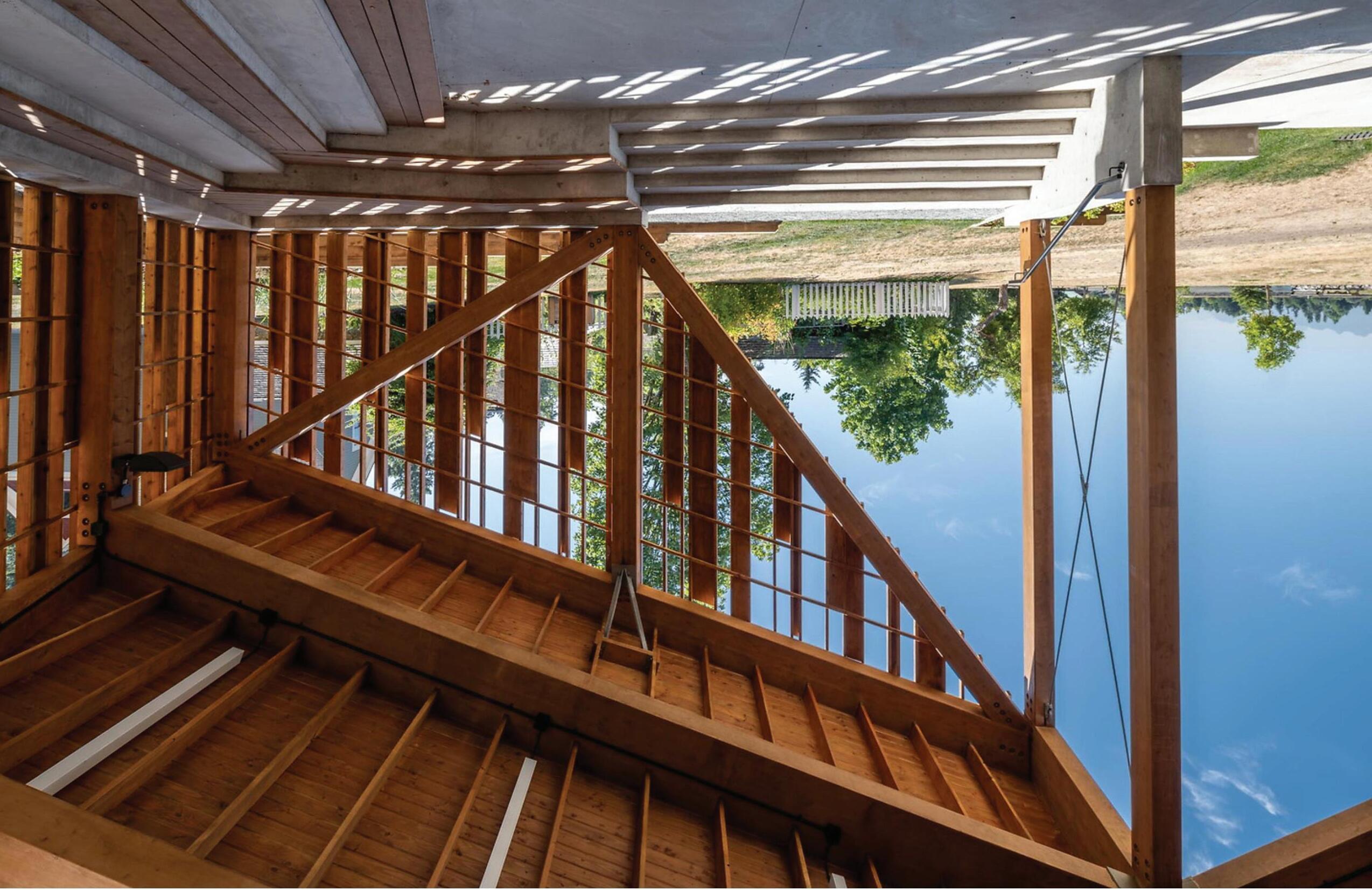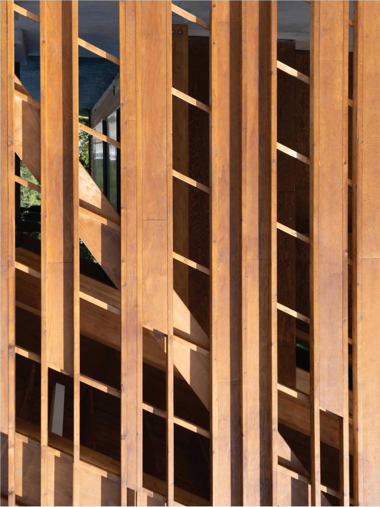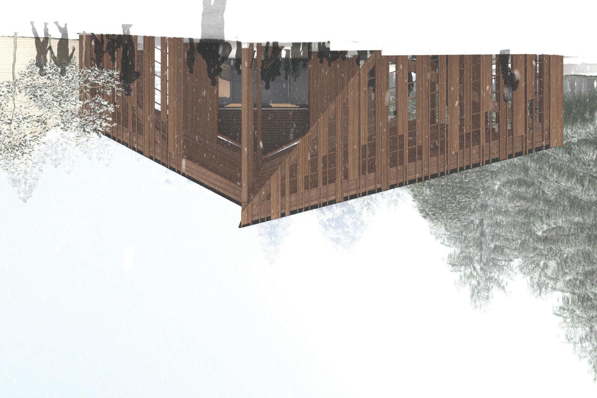 The distinctive use of wood as a material and as a utility aims to connect the past, present and future; its utilization can instantly bind nature, art and technology in ways that are sustainable and harmonious. The different textures and arrangements of solid and void create a dynamic place for igniting dialogue with the site. Interconnected pedestrian flows and views into and out from within the pavilion are filtered through perforations that enhance this experience at different times of day and season. The massing, derived from numerous structures and forms on site changes with every step around the pavilion. Connections to place are unlimited.