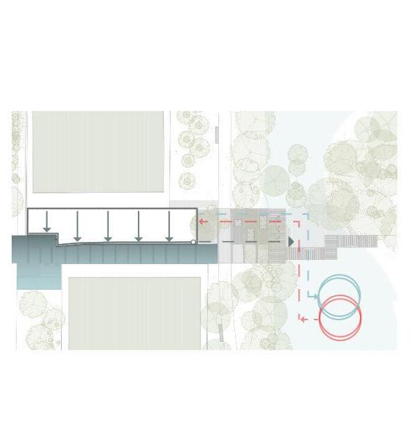 The focused program areas are collected along a long rectangular building form with the largest being the multipurpose space.
