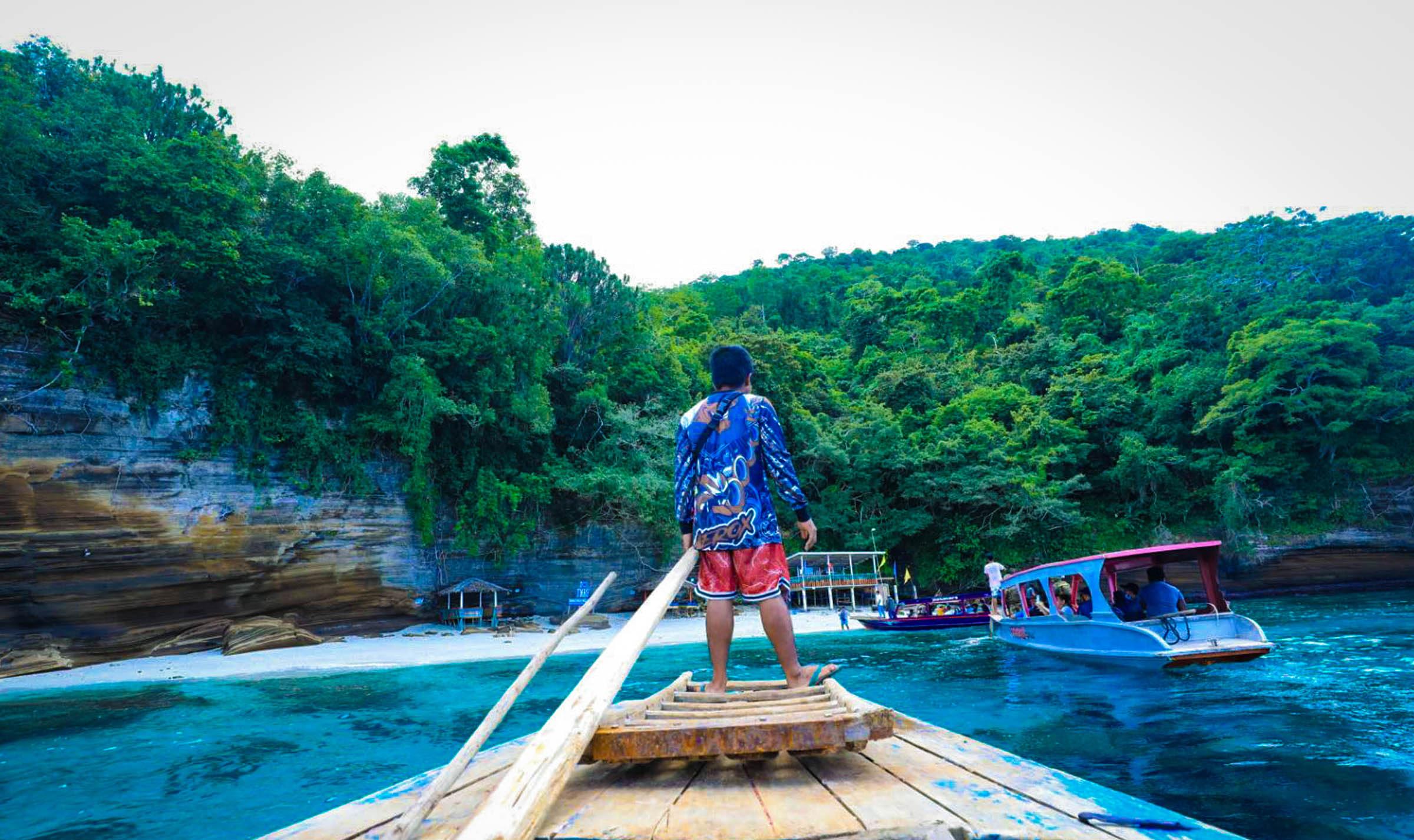 STUNNING SCENERY: A small barge crew ensures that the boat docks are safe as it approaches the calm and shallow turquoise water towards the shoreline of Tandang Mairan Rock Formation in Omar, Sulu. Sulu in the Bangsamoro region is home to a plethora of pristine beaches with powdery white sand. Story on page 2 Photo courtesy of BIO