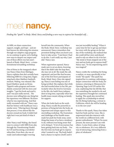 At MBS, we share connection, support, insight, and hope - and are best known for delivering this mission through our adaptive yoga program. As we continue to grow, we’re finding new ways to deepen our impact and one of those efforts was last year’s launch of Body. Mind. Story - a transformational storytelling workshop. One of those in the inaugural cohort was Nancy Glass from Michigan. Nancy explains that she’s actually been following MBS for a long time, beginning back when Matthew Sanford’s memoir, Waking, was released. She heard Matthew speak on Krista Tippett’s radio program and immediately connected with his story and insights. “I got his book and read it, and I was just really moved... The doctors were telling him one thing but his experience was different. He knew what he was experiencing. And that really resonated with me.” Nancy says that her history with healthcare was a similar story. “[Having been] through that process, it was almost like the doctors owned my body. It didn’t feel right but it was just kind of what it was.” After Nancy read Waking, she found ways to connect with MBS from afar, through the Transforming Disability CD and becoming a newsletter subscriber. Even then, she was already (and unknowingly) weaving