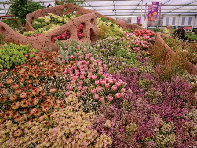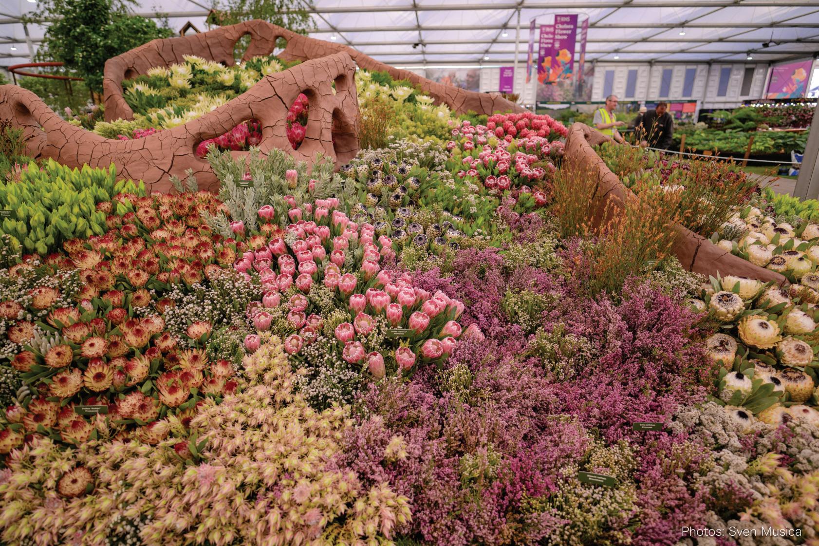 The design, inspired by the windswept slopes of the Cape mountains, was described as one of the most outstanding exhibits in the history of the Great Pavilion. Leon Kluge and artist Tristan Woudberg led a team of volunteers to create a multi-award-winning display featuring large clay sculptures that provided a striking backdrop for a stunning array of fynbos cut flowers.