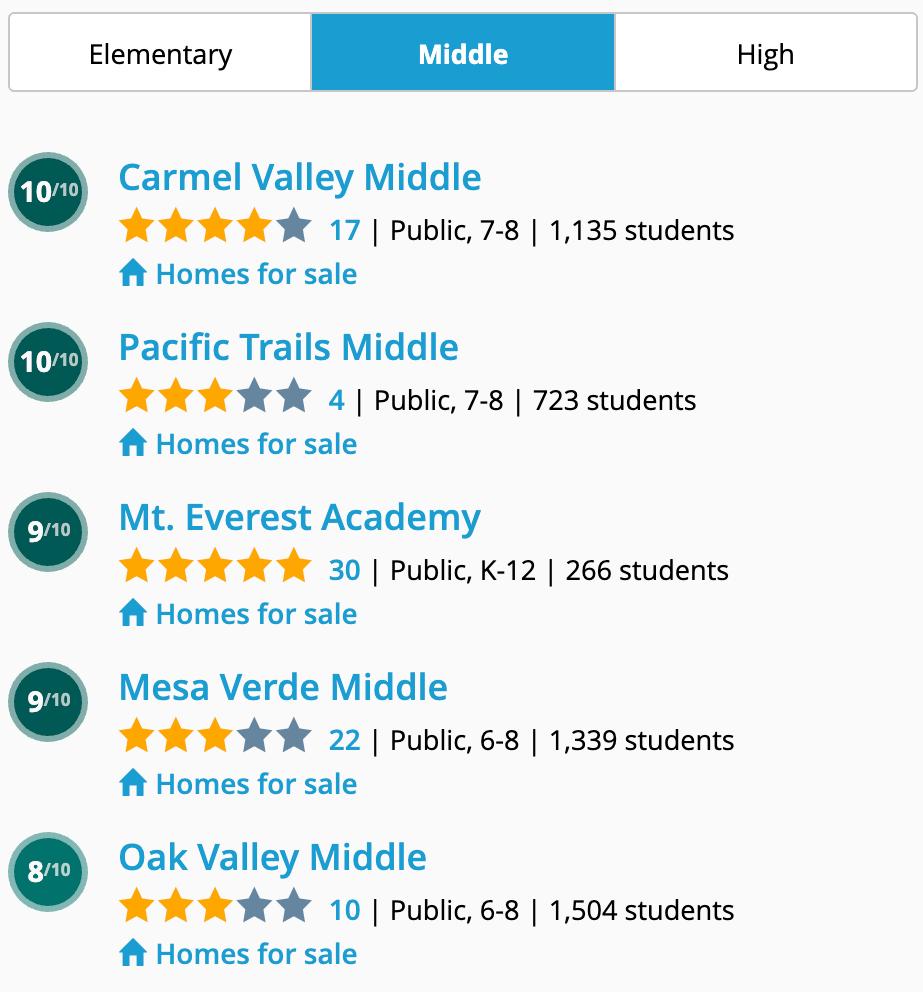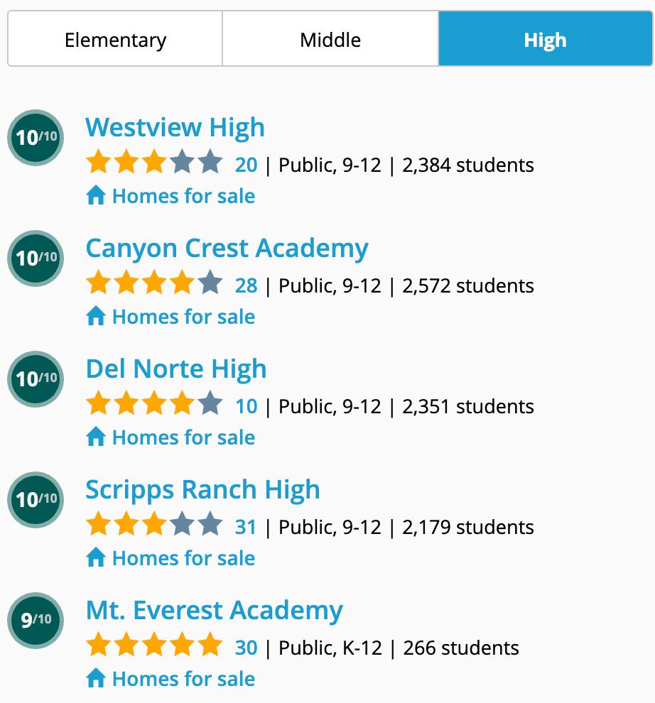 These are some of the top-rated public schools (elementary, middle, high) in San Diego based on a variety of measures, including academic performance and equity. Find out more about GreatSchools ratings.