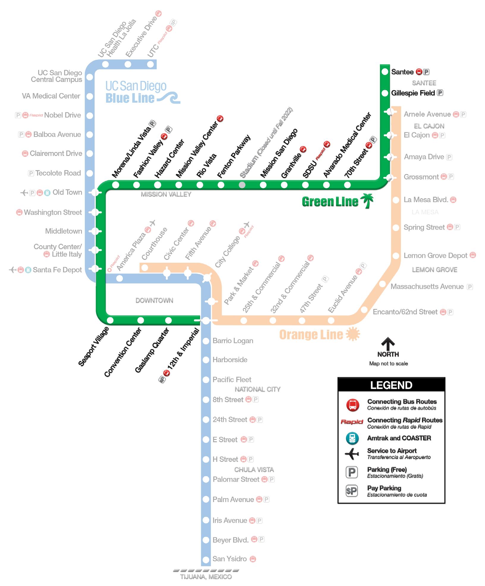 SAN DIEGO TROLLEY: The San Diego Trolley provides convenient services through downtown and out to various locations like Old Town, Mission Valley, El Cajon, Santee and San Ysidro, which is on the Mexican border. (See next page for trolley map)