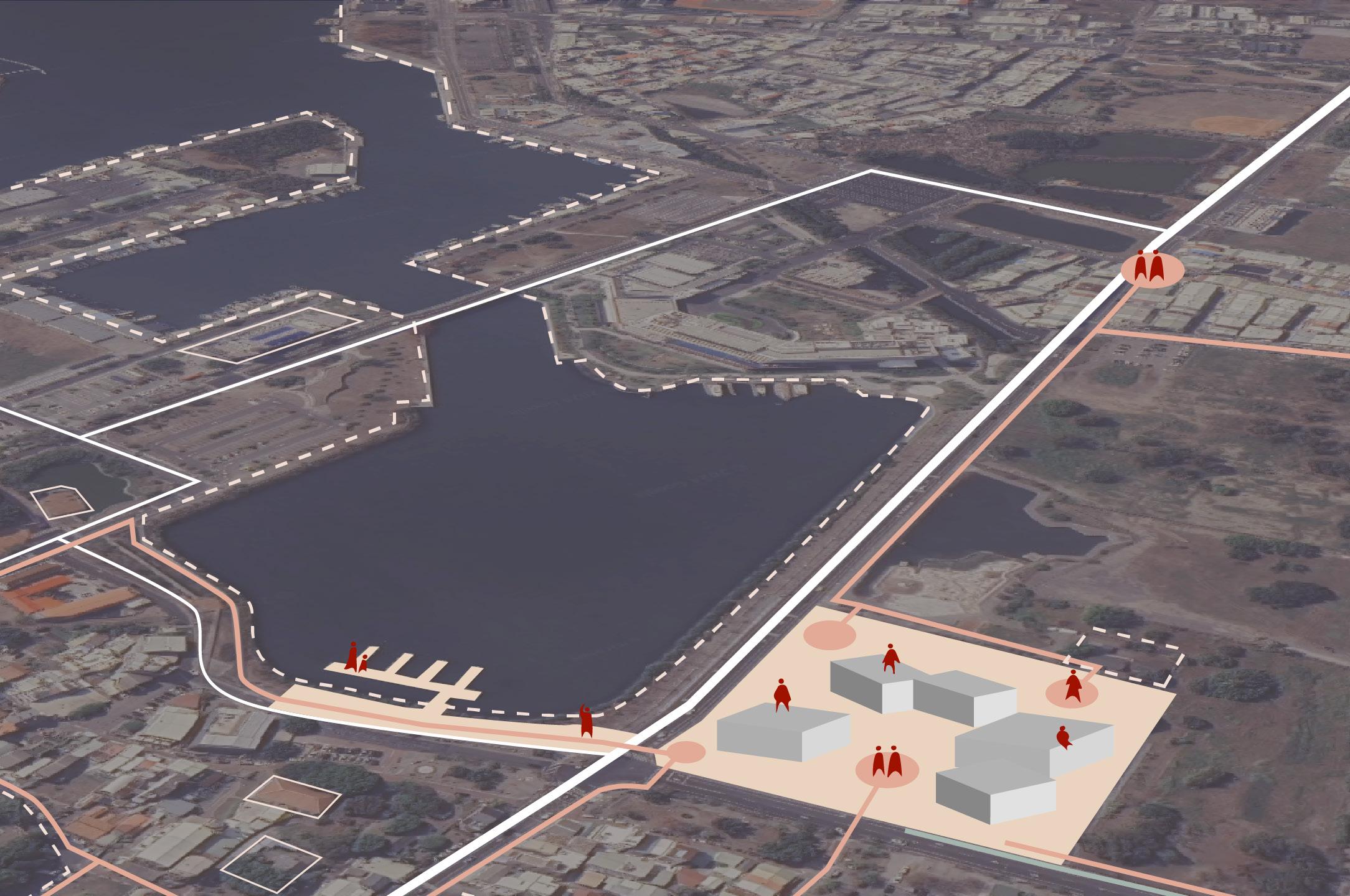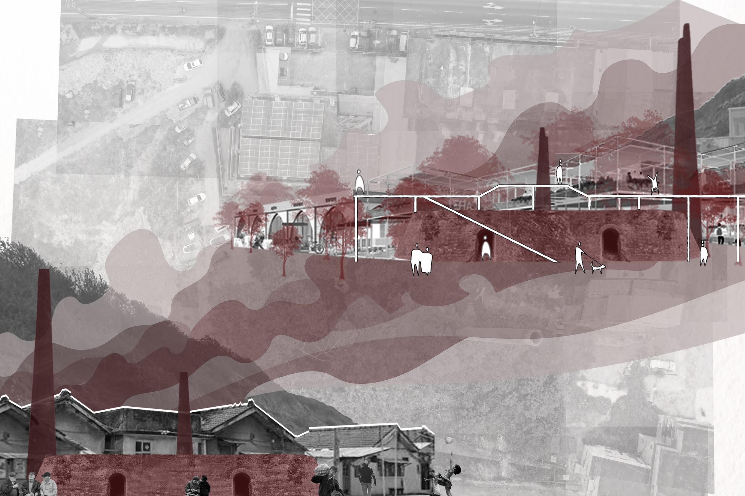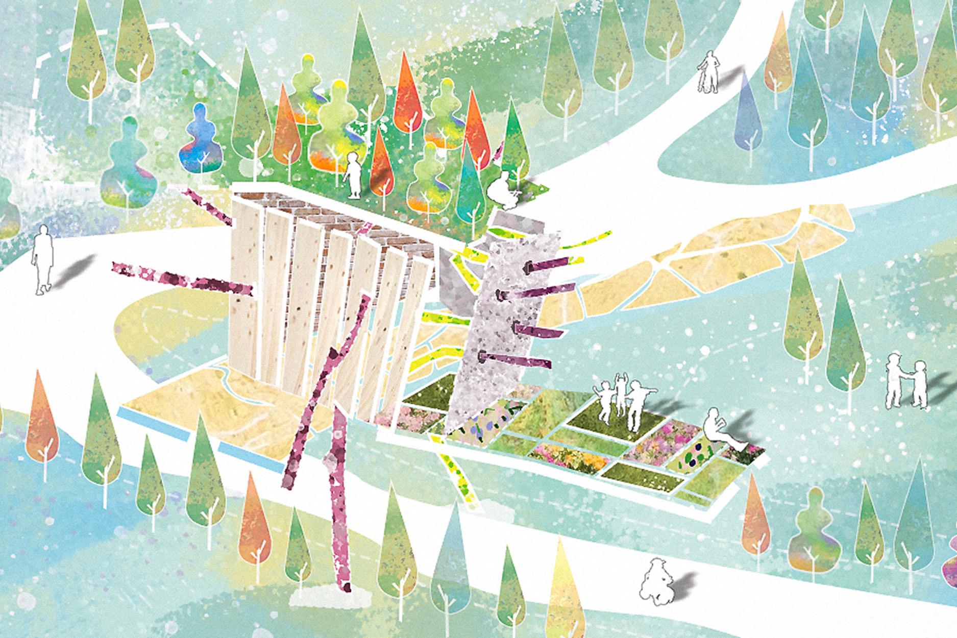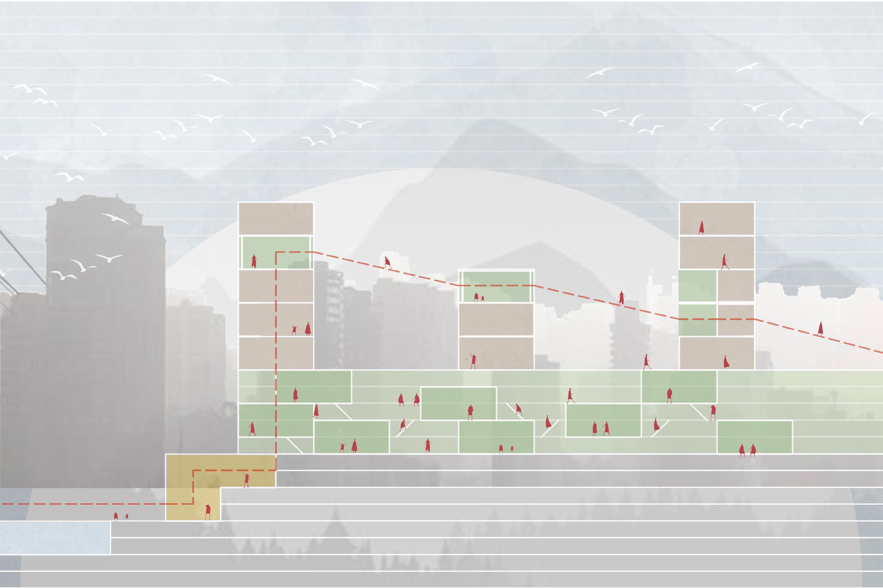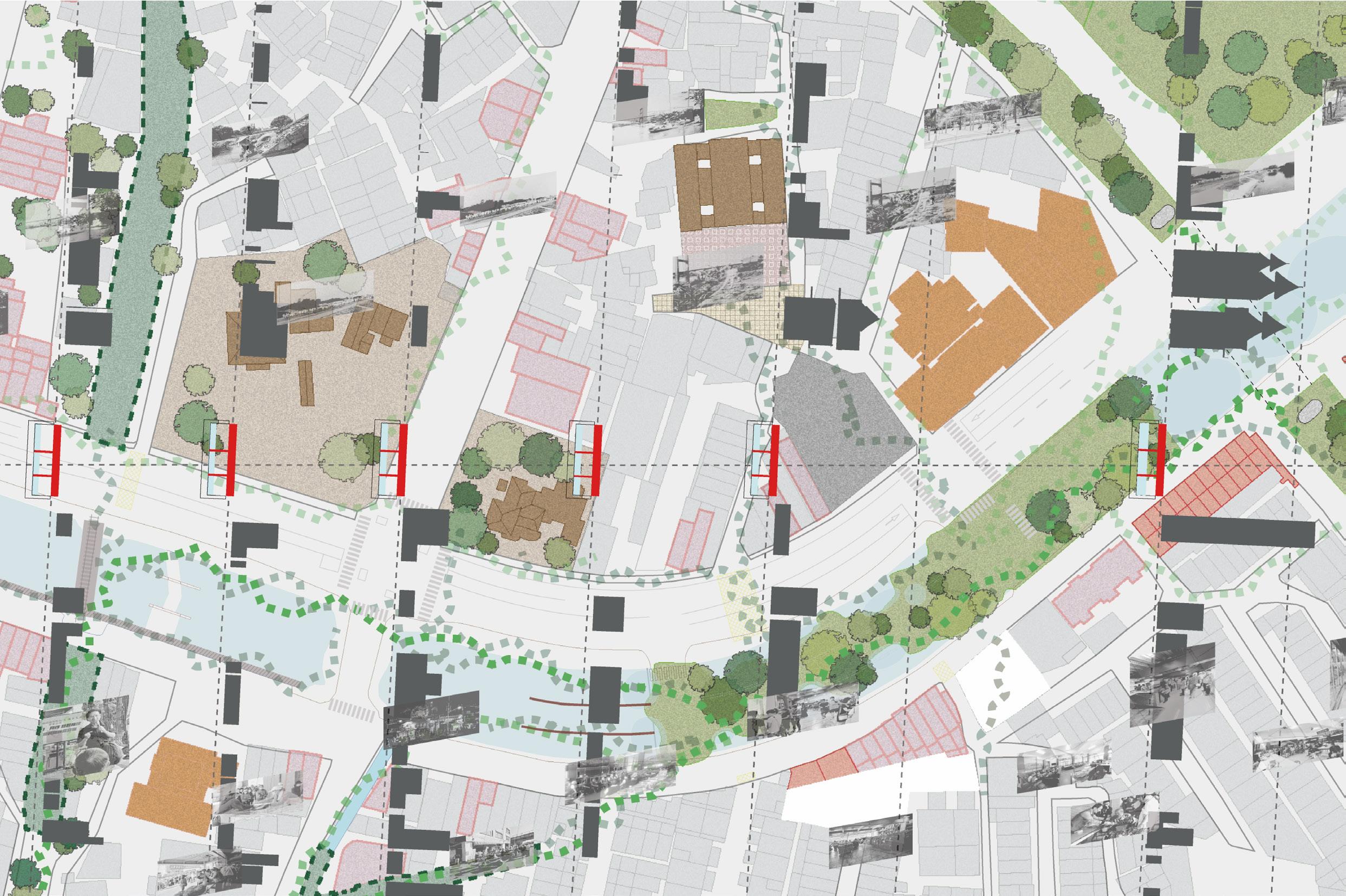試圖在橋墩柱與橋上空間的關係、公共交通區域(新舊火車路線、河濱步道、公路系統、工業運輸軌跡)與 居民活動區域的關係尋找空間解決方案。