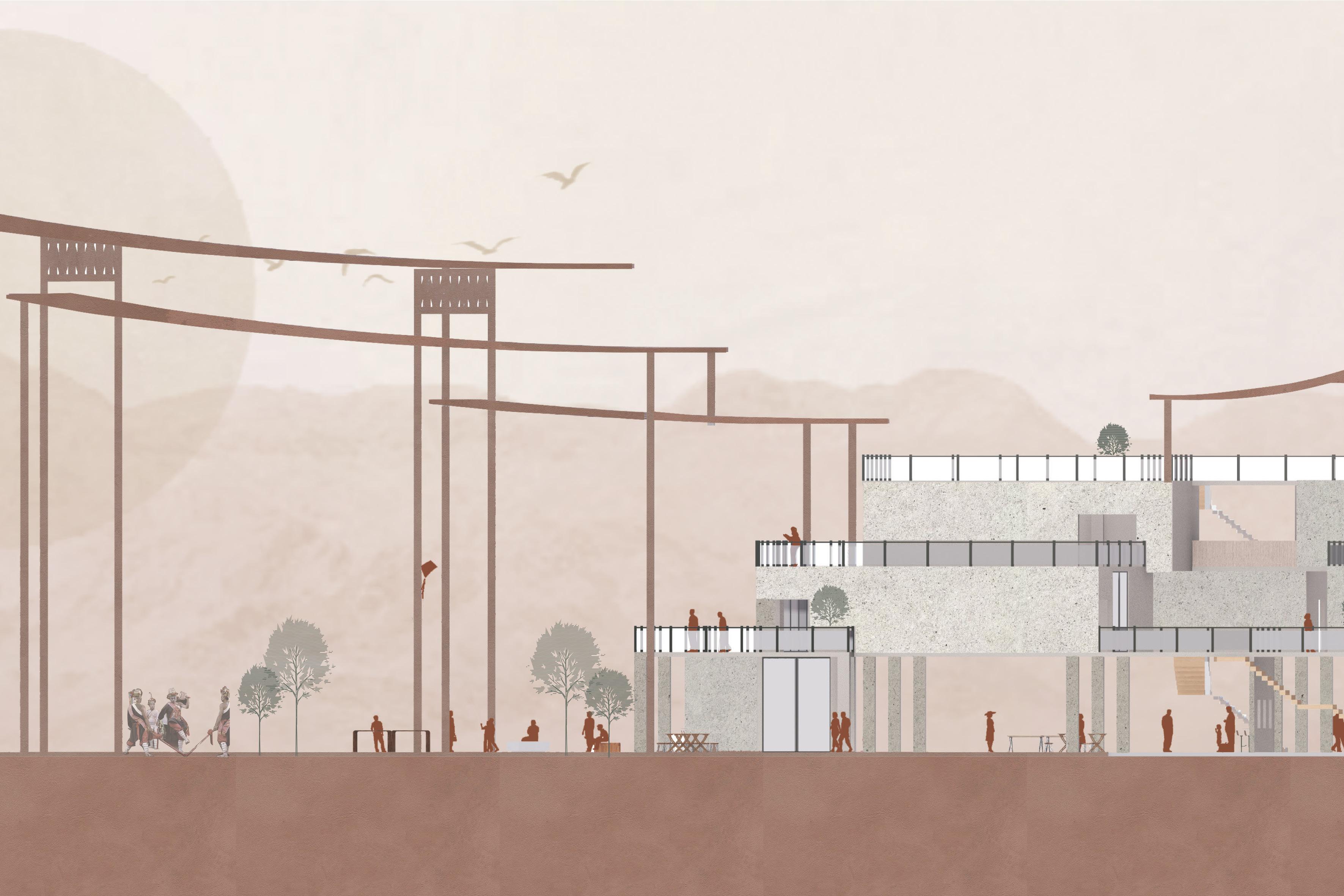 運用高雄國際商工校地活化再利用,將其轉化為一個融合社會住宅、公共性質的開放空間、社會福利、老幼 共學與商業的多功能空間。透過舊建築的部分保留與新建結合,設計引入層次平台與共享中庭,以促進代際 互動與社區交流。同時,設計響應基地周邊的輕軌交通,強化人流導向與功能布局,提升整體可達性與環境 整合性。