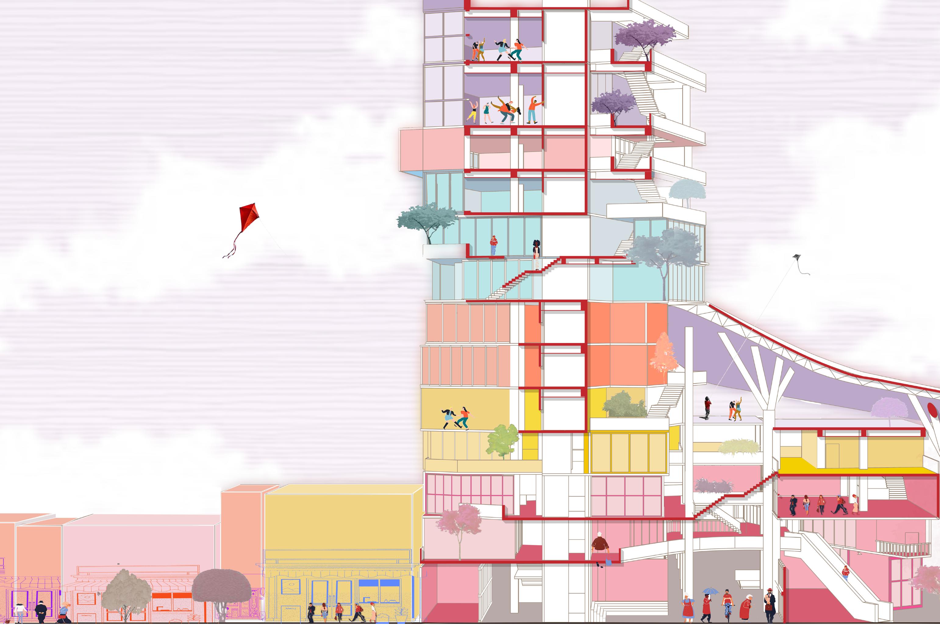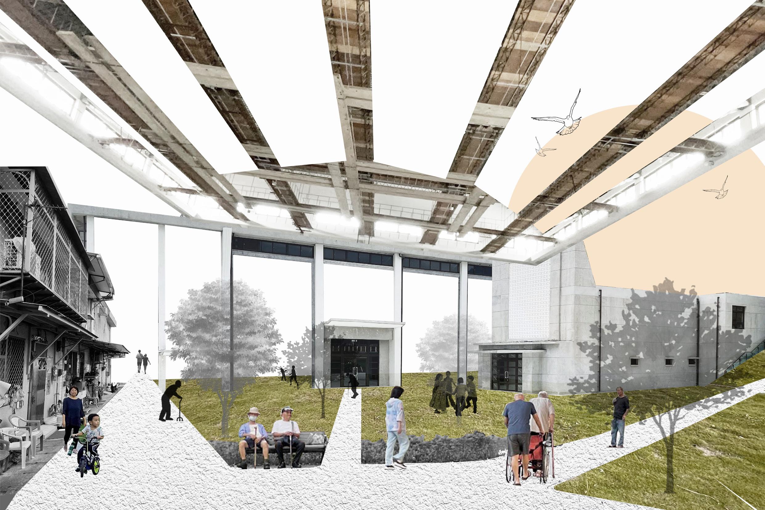 設計試圖探索如何通過開放空間與共享設施的設置,打造一個既能滿足現代居住需求,又具備社會價值與環 境可持續性的都市典範。