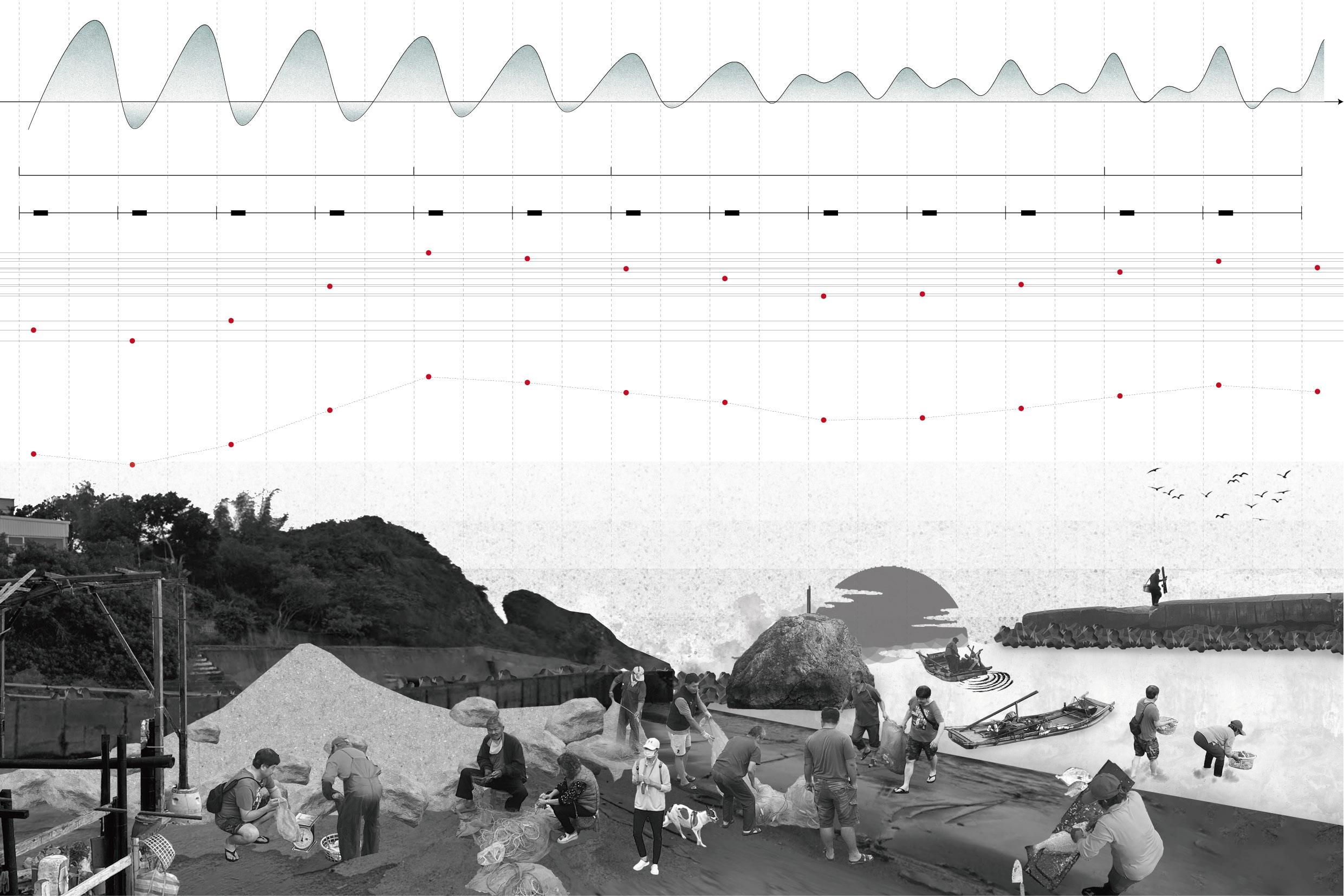 此地面對著潮汐的漲幅、以及來自山頭的地滑現象,這樣不斷改變的地景,與居民規律的生活正彼此拉扯著, 便是當地的一種日常