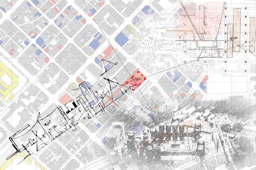 本設計試圖打破這種封閉性,透過滲透式建築策略,利用不同高程引入公共空間,透過水平與垂直向度 的滲透,讓城市活動延伸至建築內部,讓建築不再受限於單一界線,而是成為城市脈絡與日常生活交織的場 域。