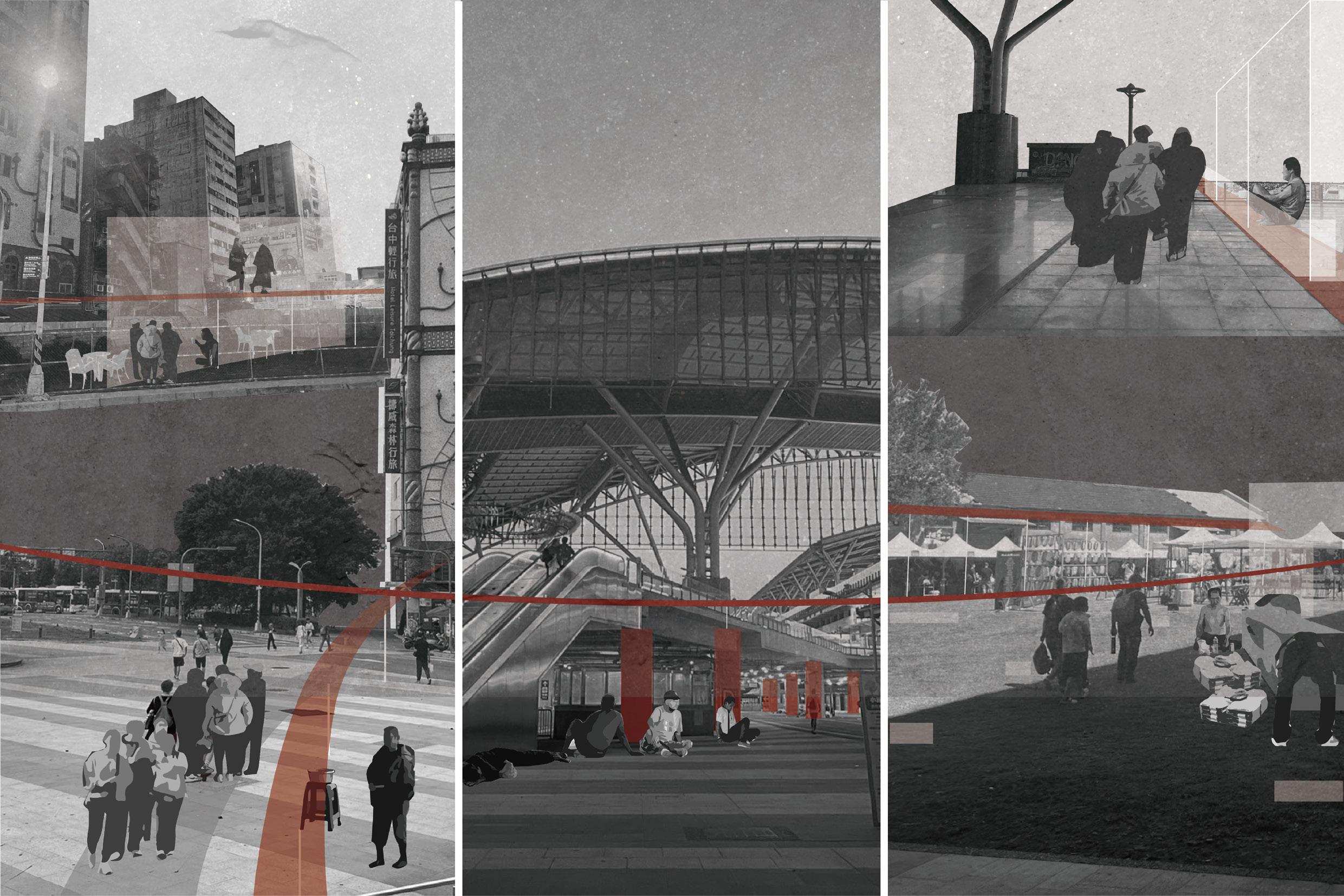 在現代社會中有著一類人,他們因各式原因失去以往所依靠的場所與人,又因制式問題無法被社會接住,最 後大部分流落到車站及其周邊,過著與街友一樣的生活,因此設計上以台中車站為出發點,將基地設置於車 站及周邊,目的在城市中的超尺度建築空間創造一個當這些失依人士將流落街頭時可依靠的場所,並做為未 來連接城市間區域的空廊,在使城市中有個能無時無刻承載住這些失依人士的場域的同時,改善周邊區域人 行空間環境,創造一個友善的城市環境。