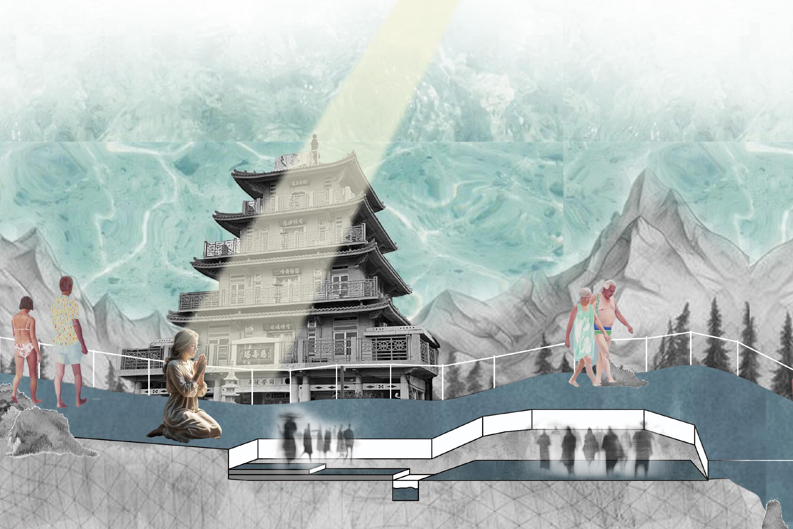 我試圖以媽祖(神)遶境的環形概念,選取基地中的點狀節點處理,操作關於災害防範與日常生活共存並置 的空間設施。