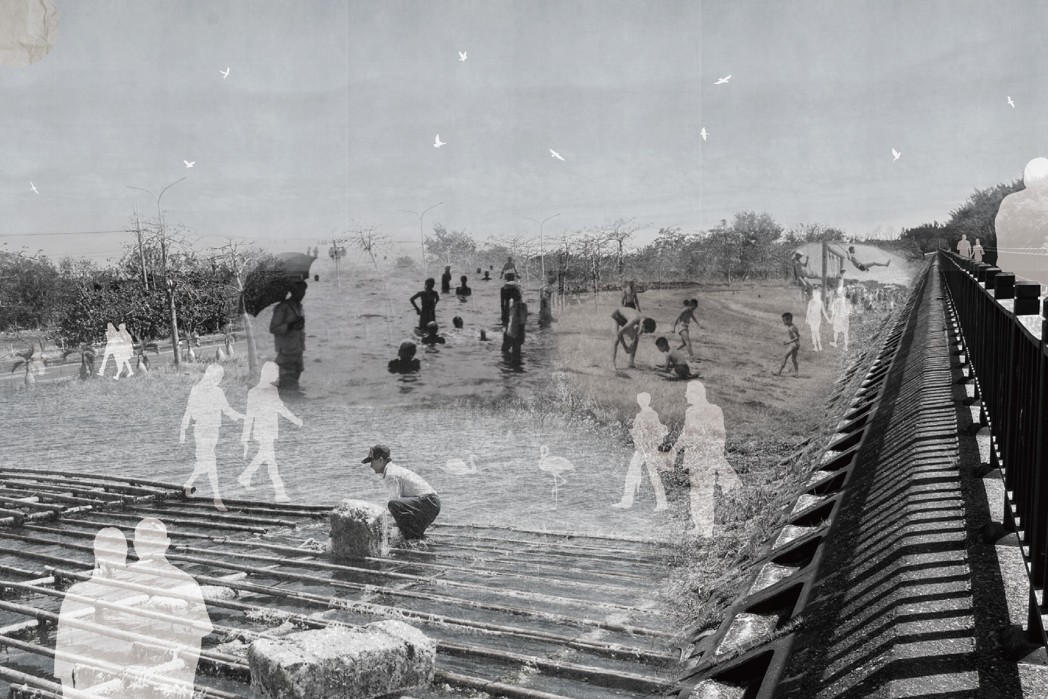 在四鯤鯓海岸,我觀察到歷史發展中的水域遺構,也思索海堤的存在。它不只是場域之間的過場,更是承載 記憶與情感的界線,卻被人們無意地忽略。我希望透過建築的介入,讓海堤成為空間的一部分,形成屬於現 代的精神場域。同時,面對四鯤鯓生活機能薄弱與漁業空間不足的問題,我提出一套以地方日常為核心的公 共場域網絡,包含共學教室、中央廚房、魚市、超市、市集、公園與觀景塔,使這座被城市遺忘的海岸角落 重新成為生活與記憶的所在。