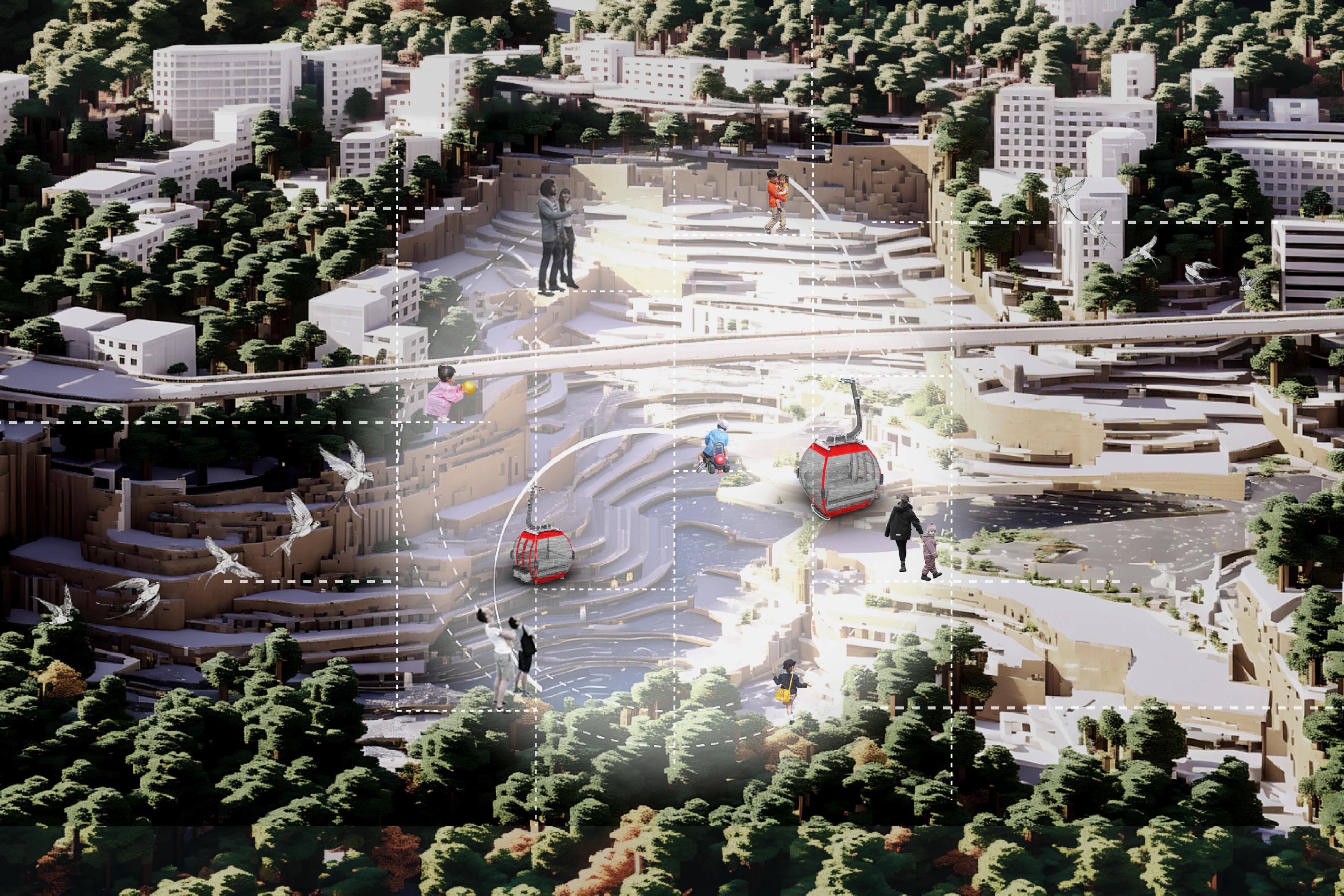 透過索道系統的重建,讓城市交通更具層次,並利用重慶獨特的地形優勢,使人們能夠在不同高度的空間中 自由活動、交流與探索。