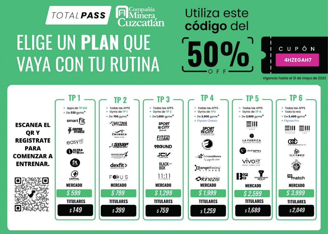 Es un beneficio de bienestar para quienes colaboramos en Compañía Minera Cuzcatlán, con el cual se puede acudir a cualquier gimnasio que se encuentre dentro de la red de TotalPass, mediante la compra de una membresía con descuento especial.