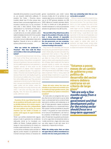 generar exportaciones para recibir nuevos recursos, empleo, etc. En se sentido, lo que nosotros dejamos es una industria en marcha que en el 2017 generará alrededor de US$ 1.000 millones en inversión extranjera directa. Es decir, la minería por sí sola generará en inversión extranjera en un año, lo que todos los sectores han generado en los últimos años. This next 24th of May, Rafael Correa will no longer be the president of Ecuador, who has been a strong advocate of responsible mining for several years. Independently from the new government, can new companies, that have come to Ecuador, feel safe to continue investing in the country? They have to feel absolutely safe because the country has generated the right conditions where a State policy has been promoted. Any government that comes in May will find mining an extremely important industry. If you listen to many of the candidates, all agree on certain points regarding the generation of foreign direct investment, the need to generate exports to receive new resources, employment, etc. In a sense, what we leave behind is an industry in progress, which in 2017 will generate about US$ 1 billion in foreign direct investment. That is, mining alone will generate foreign investment in a year, this is what all sectors (combined) have generated in recent years.