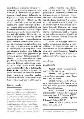 Kirjallisuutta: Arendt, Hannah: ”Eichmann in Jerusalem”, The New Yorker. Badiou, Alain: Apostoli Paavali: universalismin perustaja, suom. Janne Porttikivi, Gaudeamus. Steiner, George: Martin Heideggerin Spiegel-haastattelu. Enää vain jumala voi meidät pelastaa, suomentanut Tere Vadén, Gaudeamus. Kant, Immanuel: ”Käytöllisen järjen kritiikki”, teoksessa Siveysopilliset pääteokset, suom. J. E. Salomaa, WSOY. Meillassoux, Quentin: ”Spectral Dilemma”, Collapse Vol. IV. Rorty, Richard: Objectivity, Relativism, and Truth, CUP. empaattisen kanssakäymisen muotoihin. 30
