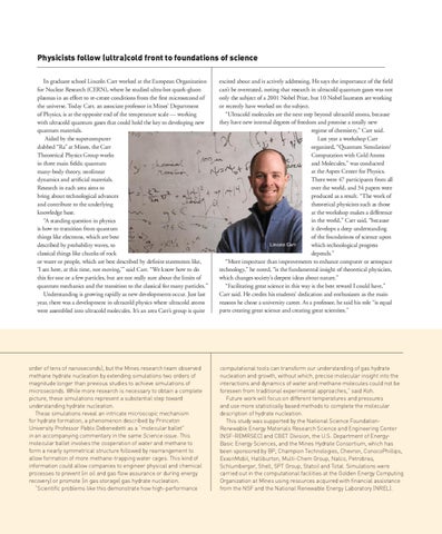excited about and is actively addressing. He says the importance of the field can’t be overstated, noting that research in ultracold quantum gases was not only the subject of a 2001 Nobel Prize, but 10 Nobel laureates are working or recently have worked on the subject. “Ultracold molecules are the next step beyond ultracold atoms, because they have new internal degrees of freedom and promise a totally new regime of chemistry,” Carr said. Last year a workshop Carr organized, “Quantum Simulation/ Computation with Cold Atoms and Molecules,” was conducted at the Aspen Center for Physics. There were 47 participants from all over the world, and 34 papers were produced as a result. “The work of theoretical physicists such as those at the workshop makes a difference in the world,” Carr said, “because it develops a deep understanding of the foundations of science upon Lincoln Carr which technological progress depends.” “More important than improvements to enhance computer or aerospace technology,” he noted, “is the fundamental insight of theoretical physicists, which changes society’s deepest ideas about nature.” “Facilitating great science in this way is the best reward I could have,” Carr said. He credits his students’ dedication and enthusiasm as the main reasons he chose a university career. As a professor, he said his role “is equal parts creating great science and creating great scientists.”