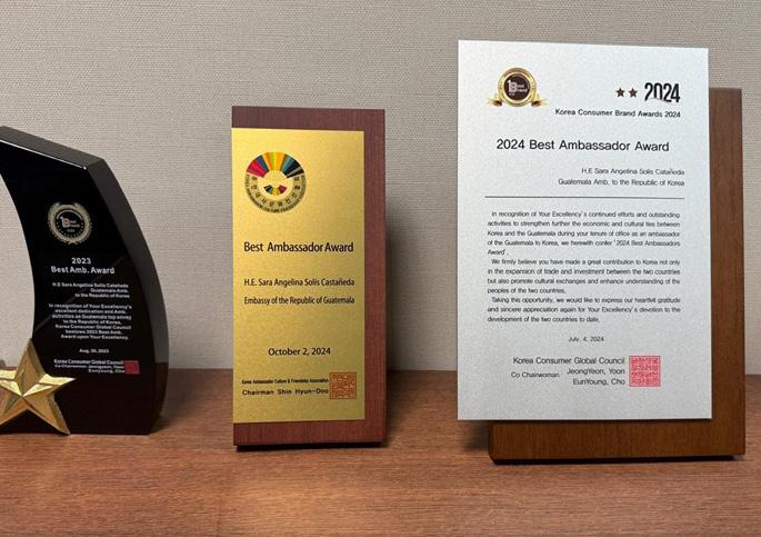 El Korea Consumer Global Council (Consejo Global de Consumidores de Corea) entregó a la Jefa de la Misión Diplomática de Guatemala, Sara Solís, en ese país el Premio a Mejor Embajadora, en el marco de la gala Korea Consumer Brand Awards. Este es el tercer galardón que recibe la diplomática guatemalteca, en reconocimiento a su trabajo para mantener la cooperación estrecha con Corea del Sur.