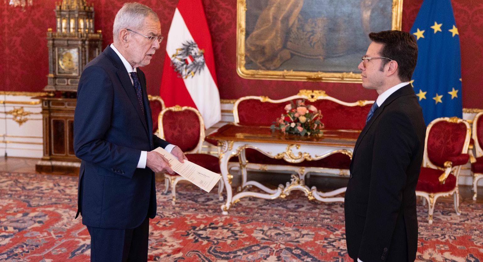 Durante la ceremonia oficial, desarrollada en las oficinas presidenciales del Palacio de Hofburg, el Embajador Orellana Zabalza trasladó un saludo del Gobierno de Guatemala en nombre del Presidente de la República, Dr. Bernardo Arévalo de León, y expresó su deseo de continuar fortaleciendo los lazos históricos de amistad y cooperación entre ambas naciones, que se han mantenido durante 155 años.