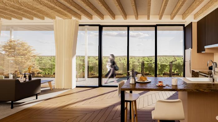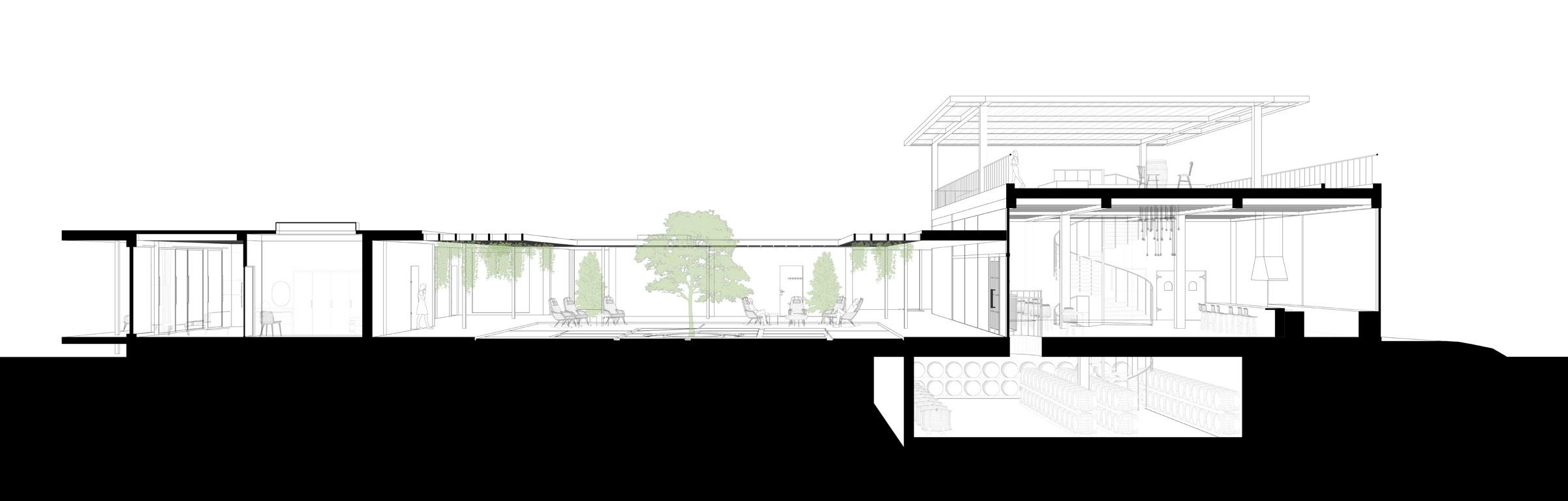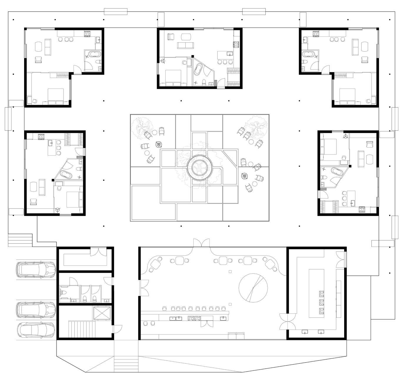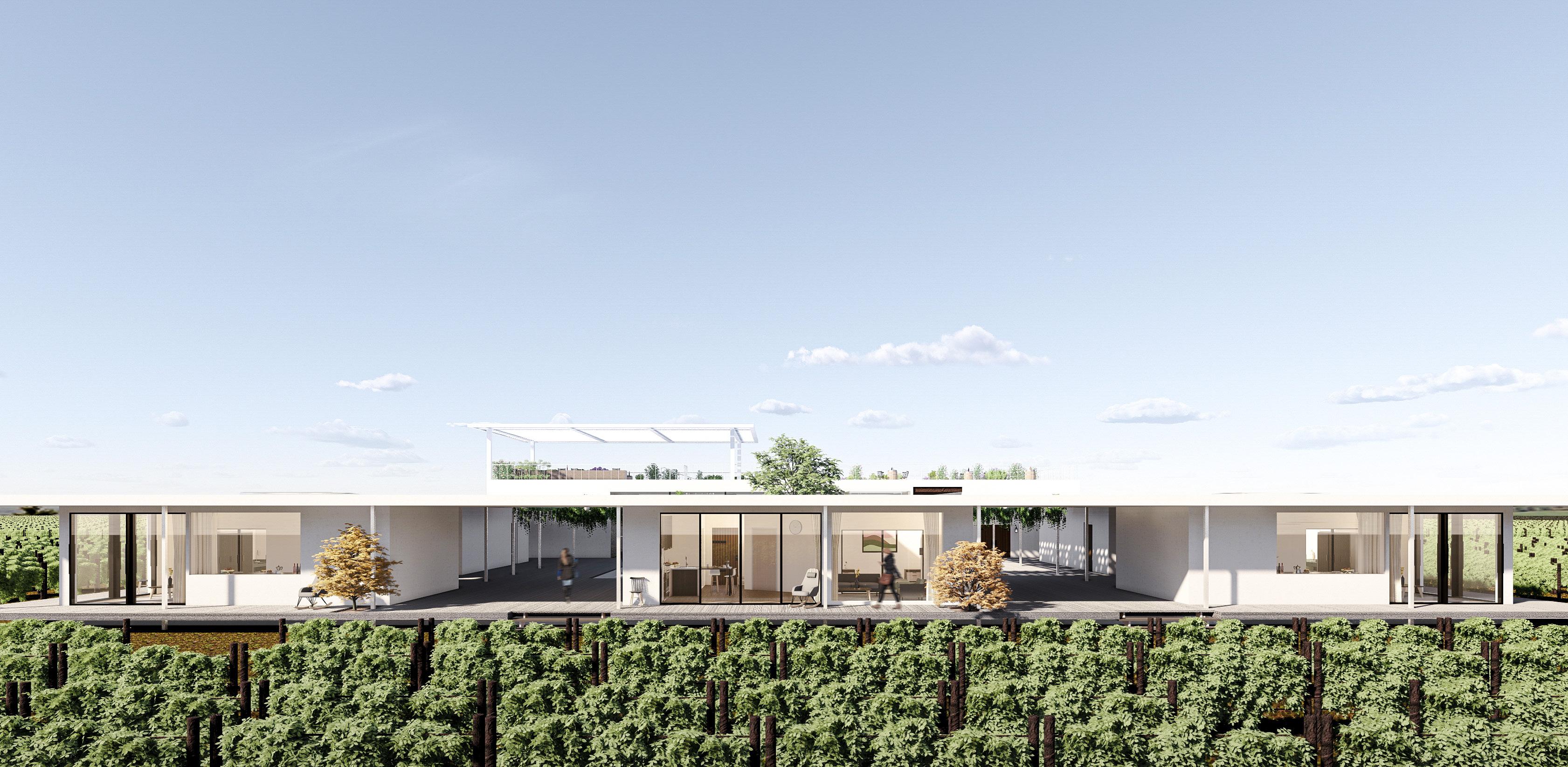 Realizing the historical and cultural root of which the winery is founded upon, the layout of the guest homes takes the form of the traditional Italian villas, where a central courtyard, accompanied by surrounding LOGGIA pathways generates an intimate space that protects the residents from the exterior, while encourages social interactions within. By extending the loggia outward beyond the boundaries of the buildings, the threshold condition contributes to the smooth transition between the outdoor nature, the social space, and the individual guest homes.