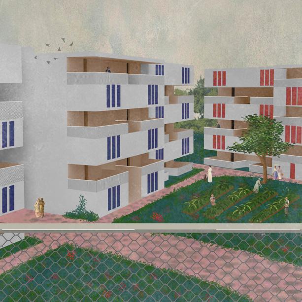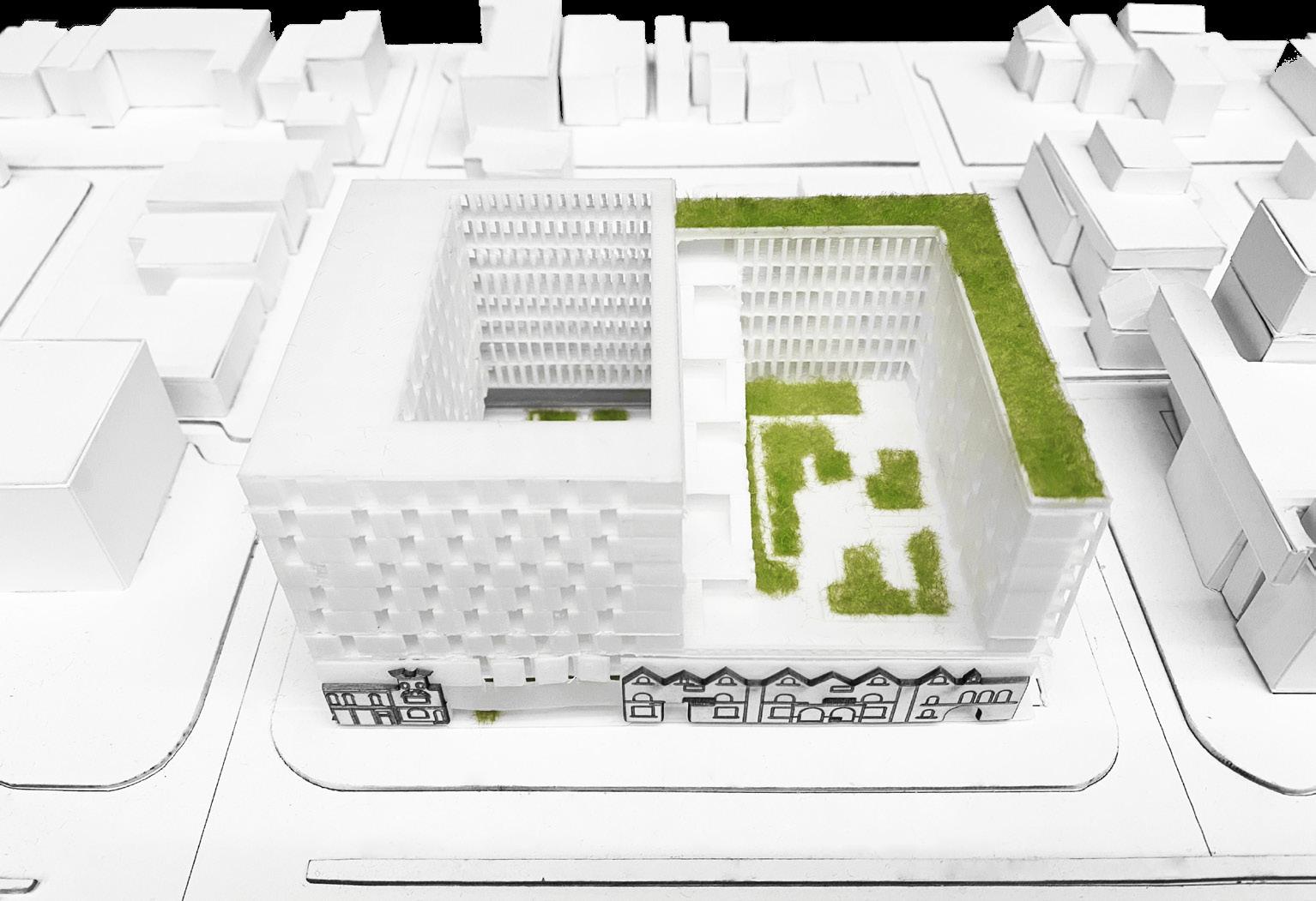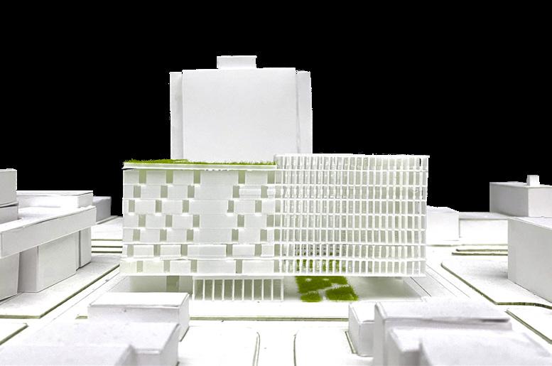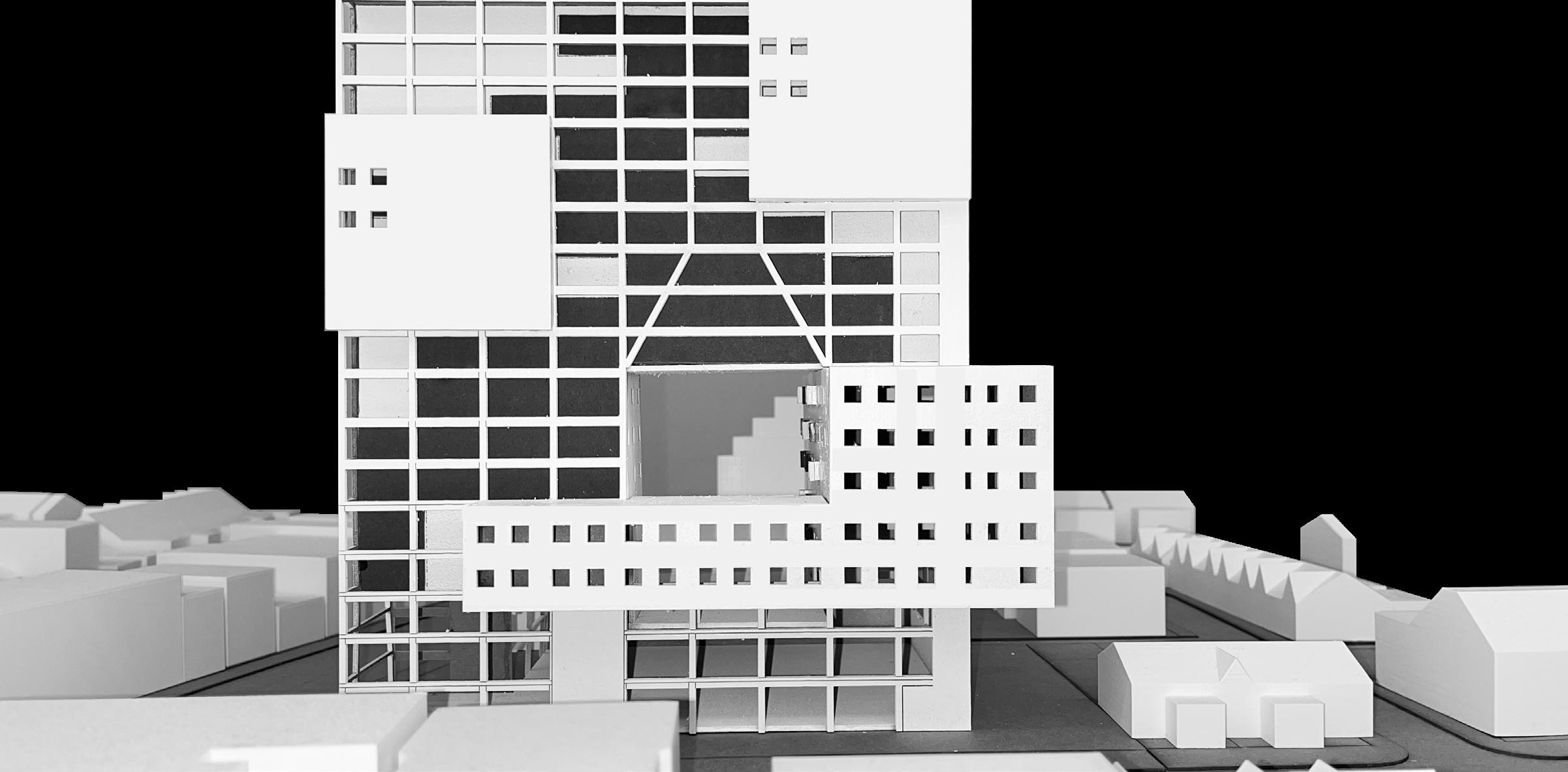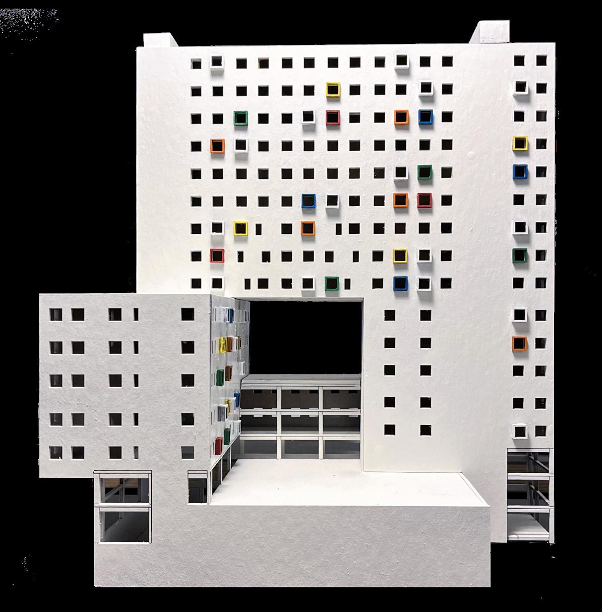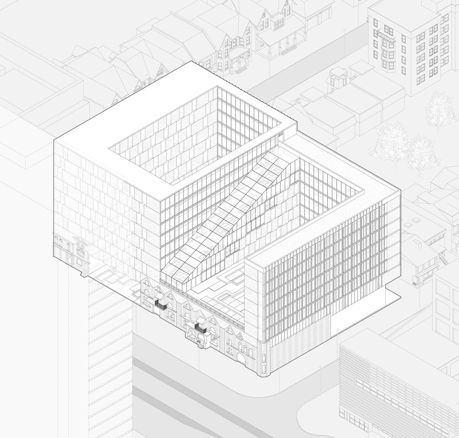 The design for the West neighborhood community center with affordable residential units is designed to be more than just a building—it’s a stage for interaction, joy, and connection. Playfulness is at the heart of the design, fostering a sense of belonging for all generations, from children to the elderly. By integrating interlocking massing and push-pull moments in the façade, the architecture creates dynamic shared spaces that blur the boundaries between public and private life. These sculpted forms provide inviting public areas, playful balconies, and generous windows, encouraging spontaneous encounters and shared experiences. In doing so, the building becomes an active participant in neighborhood life, bringing people together through spaces that inspire curiosity, engagement, and joy.