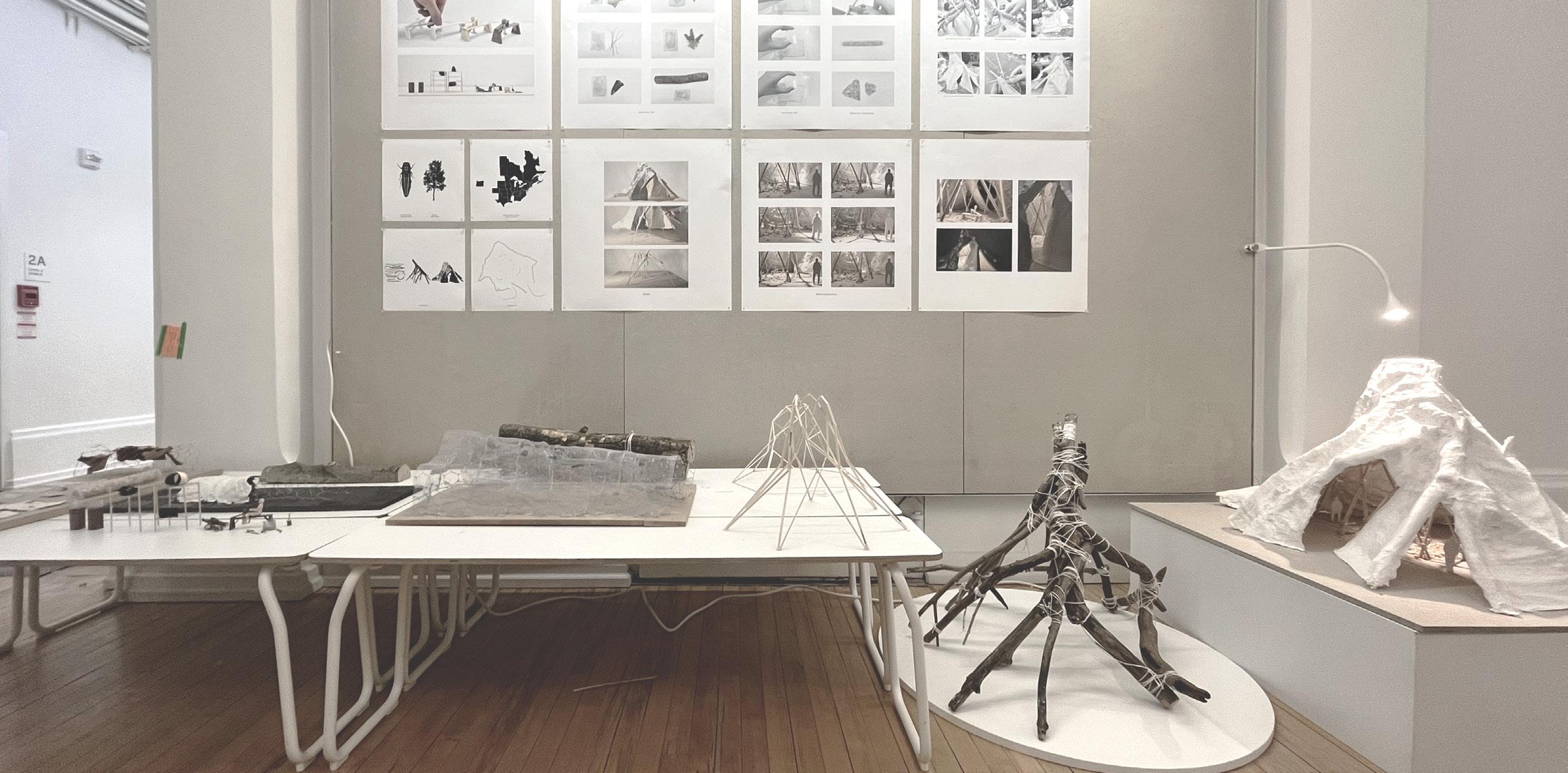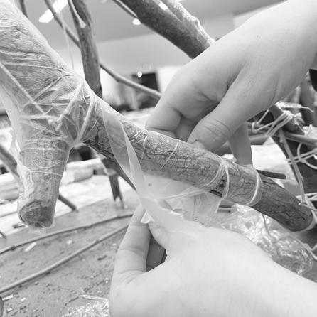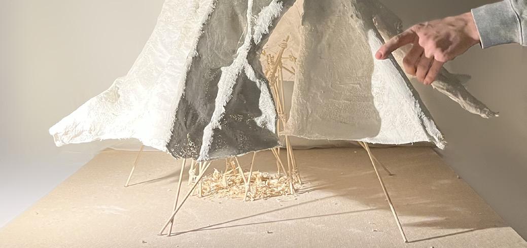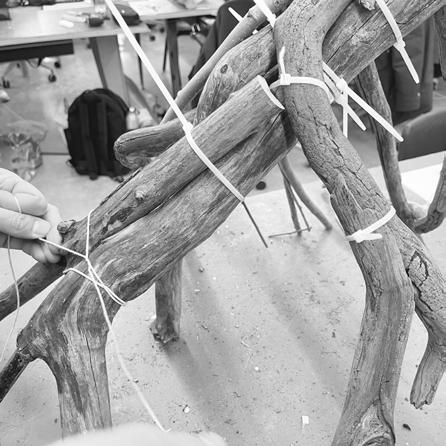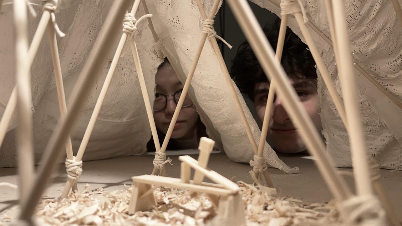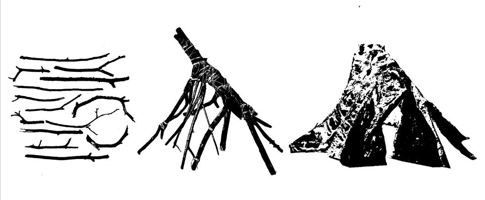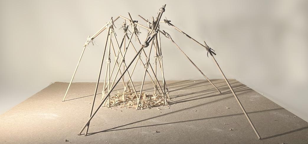 Furthermore, with the arrival of the emerald ash bore (through global trade), the Ash trees used in Mi’kmaw Basketry have become endangered, further threatening the craft. Our room takes inspiration from Johnson’s ideas of encapsulating the memory or spirit of the basket and transfers this to the memory of the material. The outer shell of our room is created from the impression of logs, assembled to resemble an upturned tree. The tree is present and absent, reflecting the disappearance of the Ash tree and one facet of the effects of settler colonialism on the environment and, in turn, Indigenous materiality and practices. Inside, offset from the outer shell, is a lashed wooden structure. This space contains the artwork and provides space for the performance. The geometries produced by the lashed wooden structure are meant to reflect the patterns in weaved baskets. The area between the structure and the shell serves as a space for viewership and reflection. Pieces of the structure reach out and connect back to the shell, tracing the impressions of larger branches, tracing the shift from the organic to the highly geometric. This signifies the relationship between the material and the craft, the tradition and the settler effects upon it. Viewers within the space are forced to confront these topics, towards the center, the effects of settler colonialism have had on Indigenous peoples and their culture, and to the outside, the effects on the environment and nature.