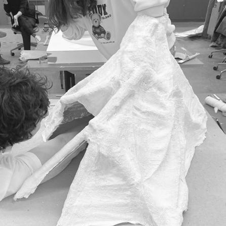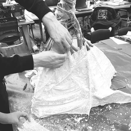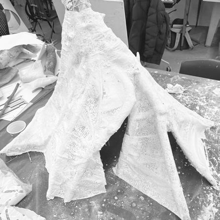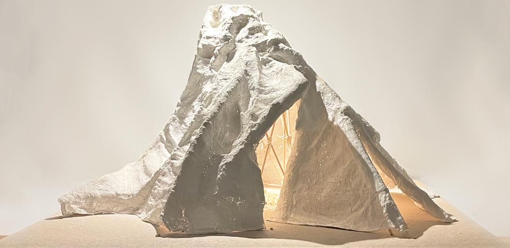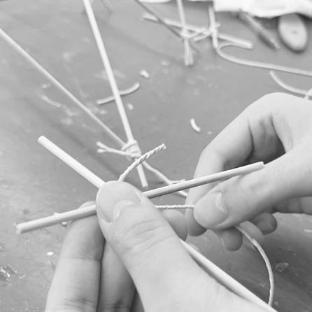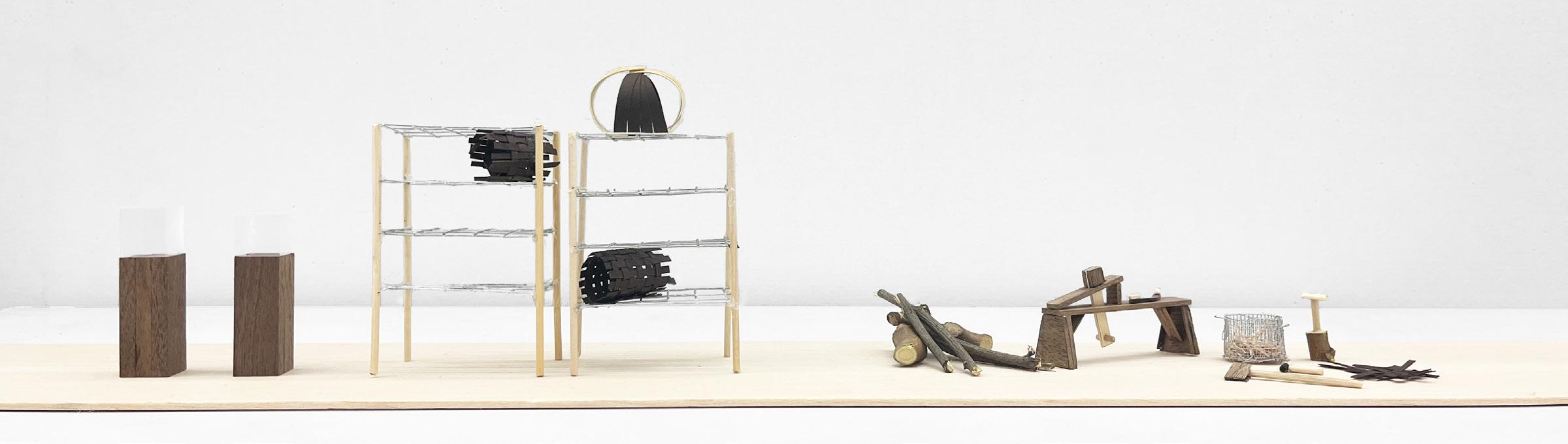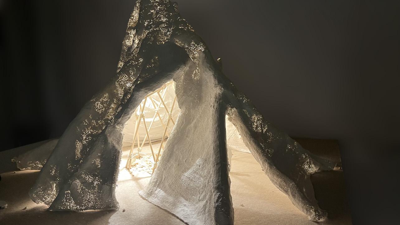 Furthermore, with the arrival of the emerald ash bore (through global trade), the Ash trees used in Mi’kmaw Basketry have become endangered, further threatening the craft. Our room takes inspiration from Johnson’s ideas of encapsulating the memory or spirit of the basket and transfers this to the memory of the material. The outer shell of our room is created from the impression of logs, assembled to resemble an upturned tree. The tree is present and absent, reflecting the disappearance of the Ash tree and one facet of the effects of settler colonialism on the environment and, in turn, Indigenous materiality and practices. Inside, offset from the outer shell, is a lashed wooden structure. This space contains the artwork and provides space for the performance. The geometries produced by the lashed wooden structure are meant to reflect the patterns in weaved baskets. The area between the structure and the shell serves as a space for viewership and reflection. Pieces of the structure reach out and connect back to the shell, tracing the impressions of larger branches, tracing the shift from the organic to the highly geometric. This signifies the relationship between the material and the craft, the tradition and the settler effects upon it. Viewers within the space are forced to confront these topics, towards the center, the effects of settler colonialism have had on Indigenous peoples and their culture, and to the outside, the effects on the environment and nature.