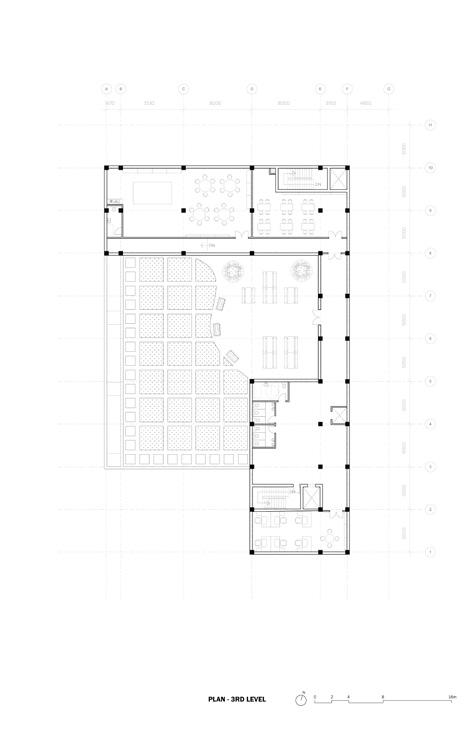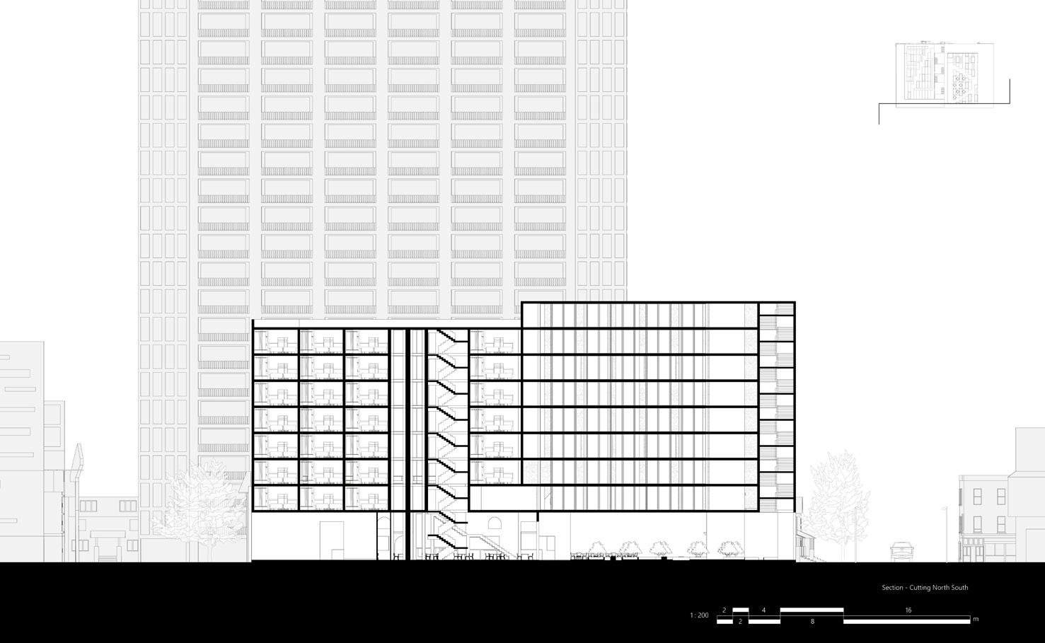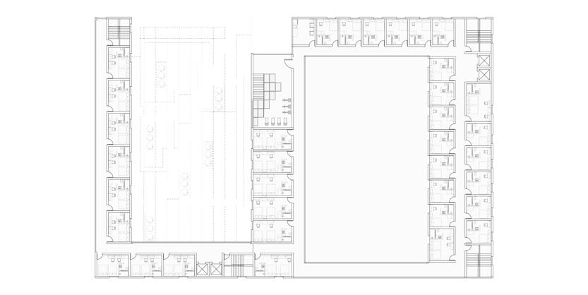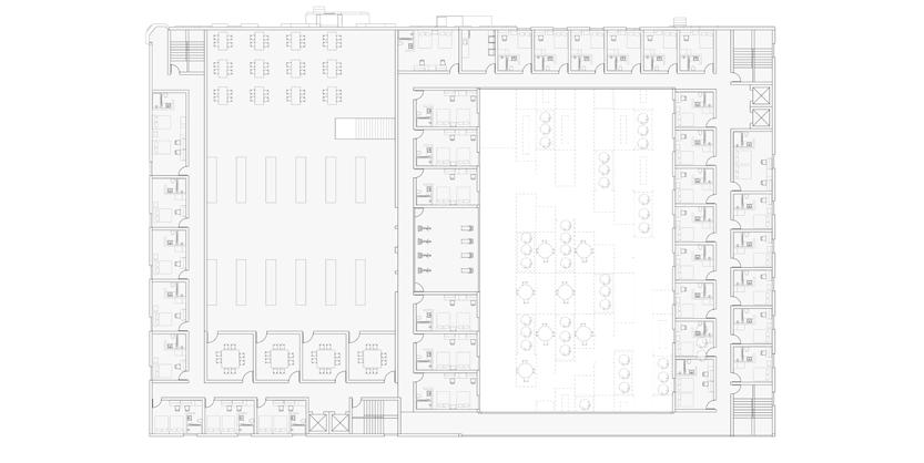 The design kept the heritage facade of the building and take use of the openings for multiple entrances for different population. A cafe was designed on the ground floor connected with the student dining hall, with seperated entrances from the lobby of student residential area. Library and study rooms were located on the second floor and social spaces were distributed evenly on each floor with gyms, kitchen and study lounge.