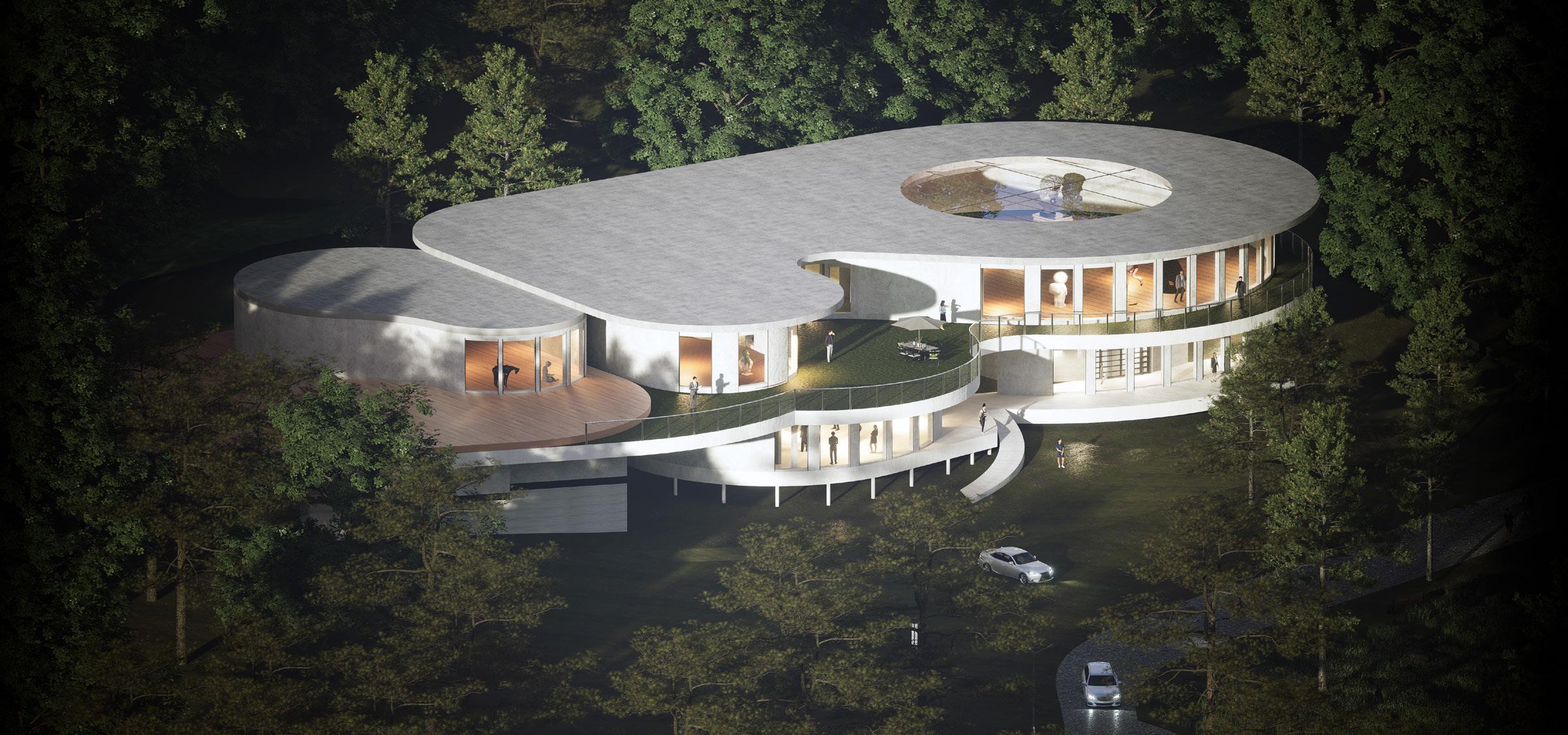 In terms of program, the design emphasizes gathering and storytelling through spatial organization. Inspired by the spiritual fire of Indigenous cultures, the primary spaces take on circular forms to foster a sense of community. These spaces, along with those of the existing visitor center, are then wrapped in a fluid, curving form reminiscent of water’s movement. The exhibition and event spaces all face east toward the lake, incorporating a fireplace and skylights that introduce a single dramatic light source. To balance openness with the need for fire safety, a double-layered facade system is introduced—large glass panels as the inner layer, and operable solid panels as the outer, allowing for flexible enclosure and controlled views of the landscape.