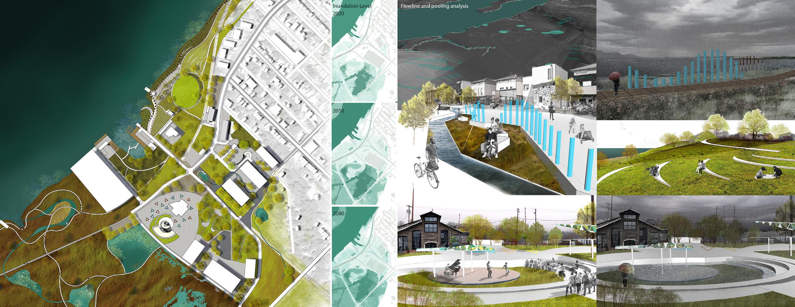 The natural process of sea level rise is so gradual that it may take years before we could perceive any major changes. Landscape design could perform as a time refractor, which would reveal the process of climate change and sea level rise to people. For the riverfront of the city of Hudson, we proposed to register the inundation level with landscape design while protecting the infrastructure and celebrating the local culture and history.
