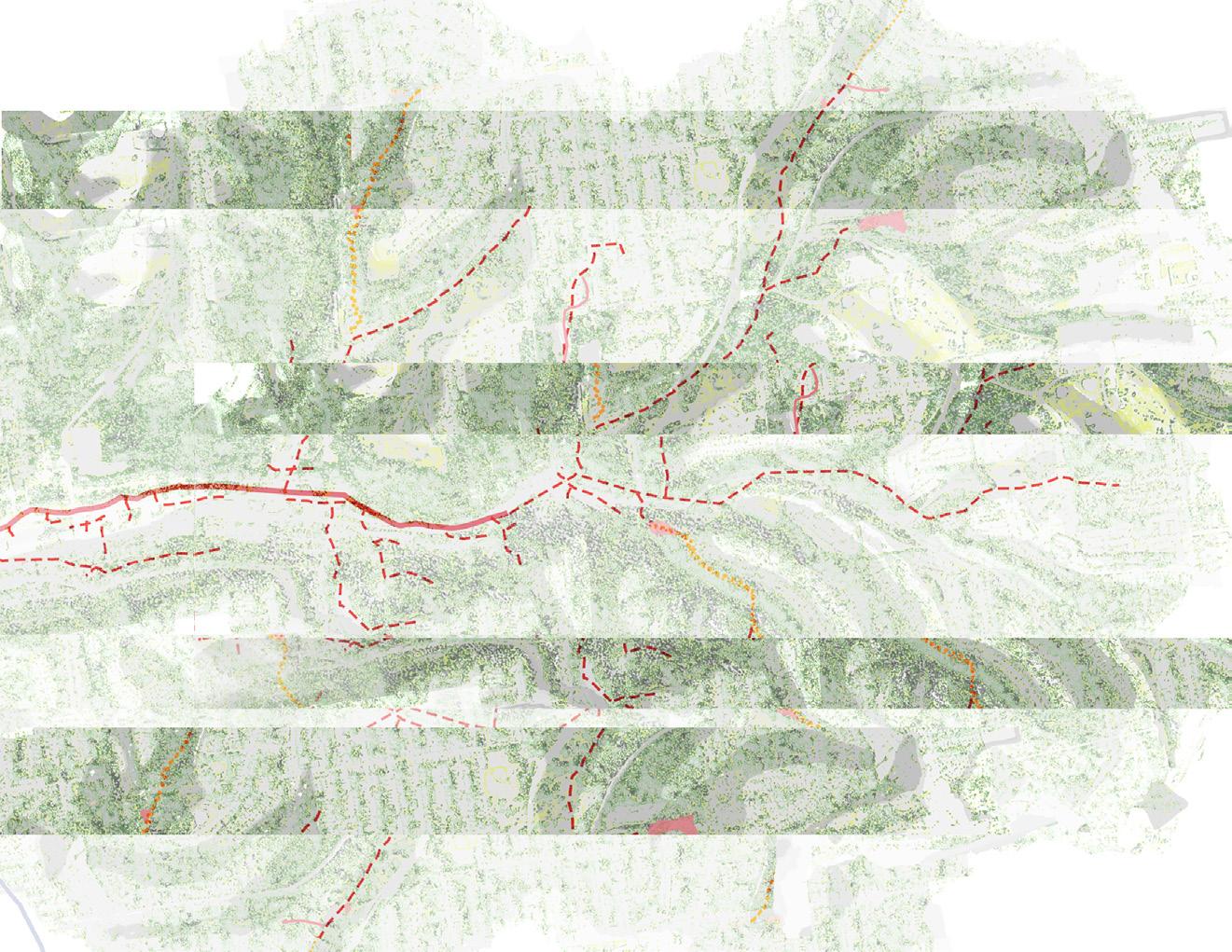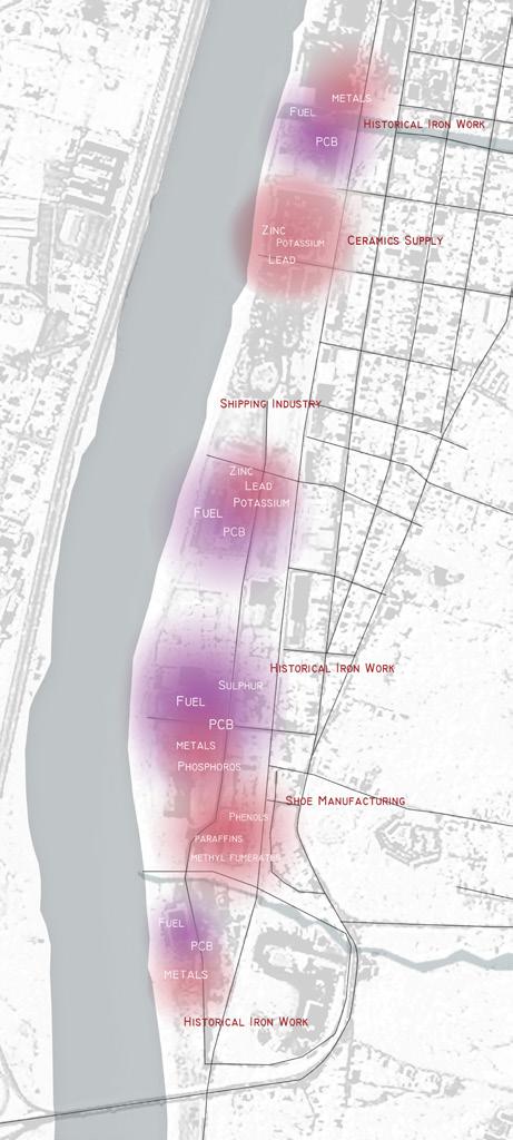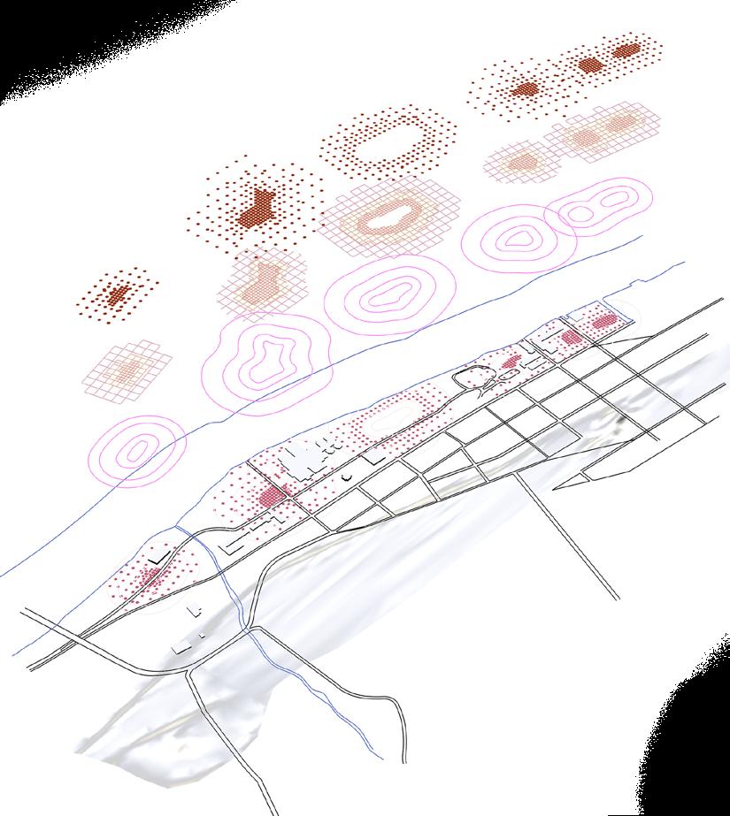 Using the distance from the source of historical industrial pollution as the reference, a grid of phyto-remediation was created. Trees with remediation benefits will be planted on the grid. The density of planting decreses as the grid gets further away from the pollution source.