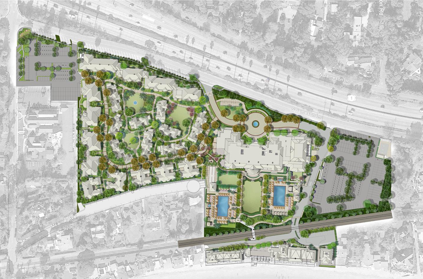 Rosewood Miramar Beach Hotel is an idyllic coastal retreat developed by Caruso. The landscape is designed with a classic style, with a circular guest arrival driveway featuring a fountain in the middle, great lawn area surrounded by traditional garden plants like roses and formal boxwood hedges, a main pool lined with cabanas, a family-friendly pool surrounded by a verdant assortment of palms, magnolia trees, lemon citrus trees olive trees and roses. Garden areas with trellises, hedges, and meandering paths are designed for several types of guest accommodations, including bungalows, garden cottages, family cottages, and lanais. An event lawn and bocce court provides guests with additional entertainment opportunities. A boardwalk is also designed for access to the beach across an existing railroad track.