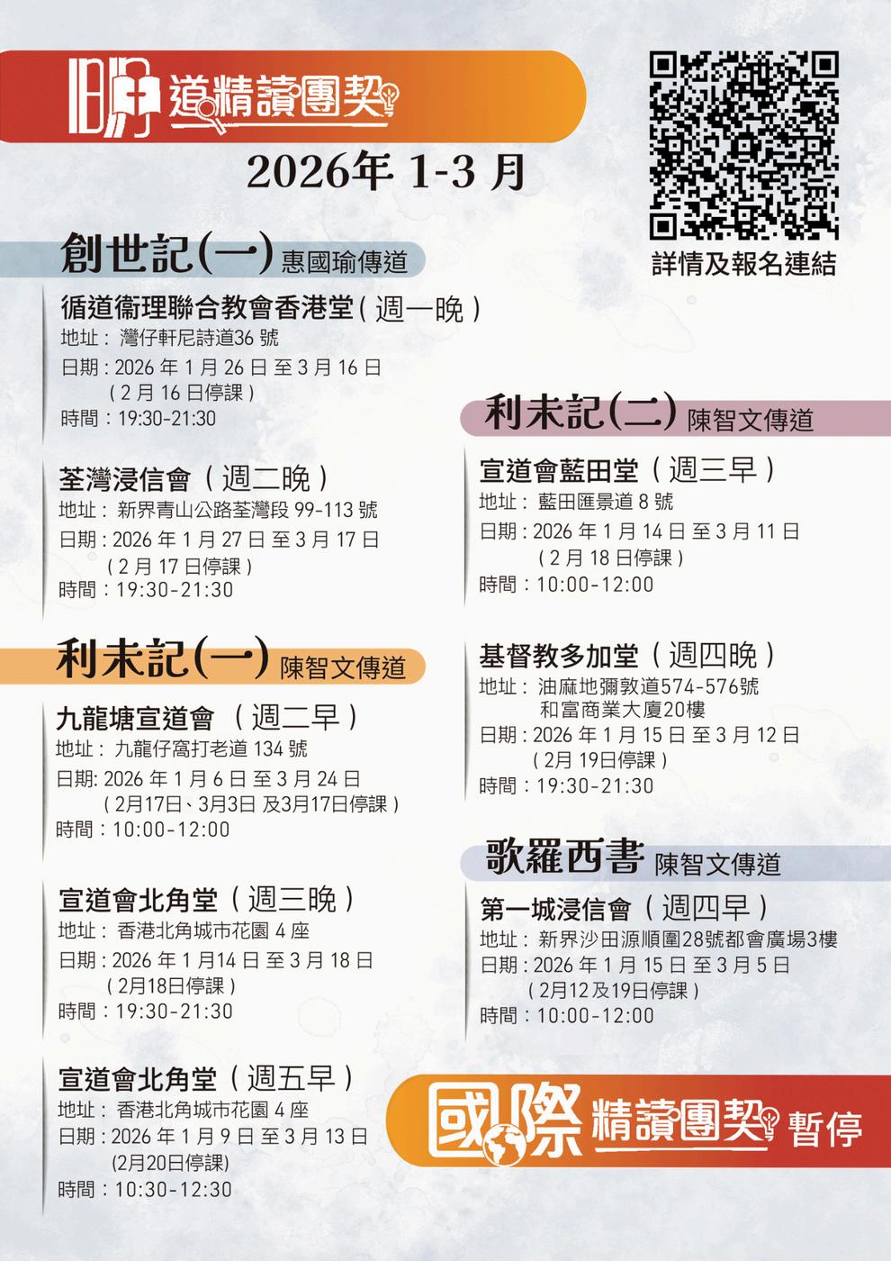 我們現正積極籌備2026年的「明道研經講座」,願神給我們預備合適的講員及 主題,並讓我們與合辦教會有美好的配搭。